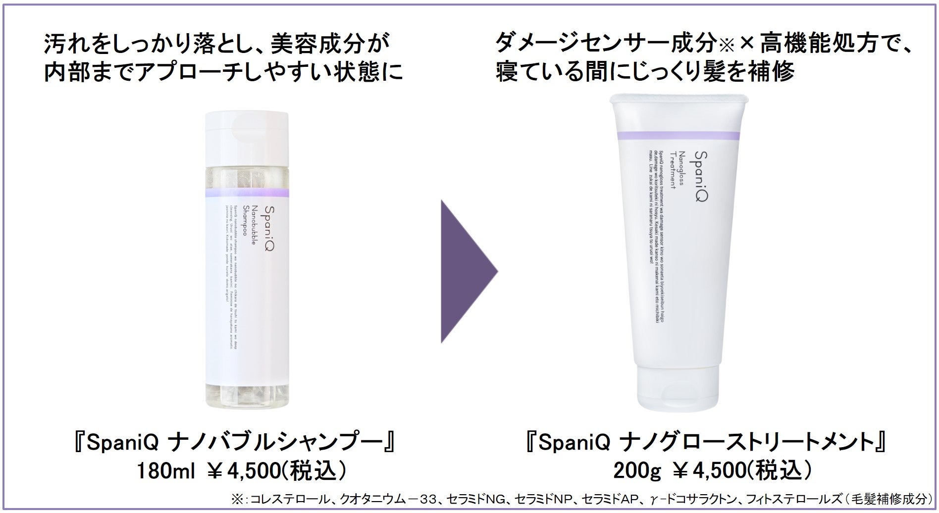 頭皮毛穴の汚れをしっかり落とし、年齢によるうねりやパサつきを抑える効果を発揮する「SpaniQ ナノバブルシャンプー」は、導入美容液成分(※1)を配合し、後に使うトリートメントのなじみをよくするため、『SpaniQ ナノグローストリートメント』とのライン使いで、寝ている間にじっくり効果的に髪を補修します。