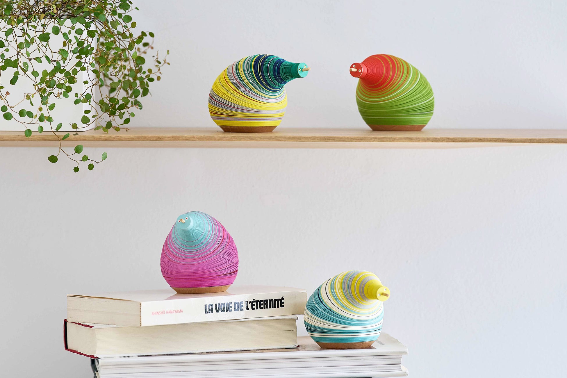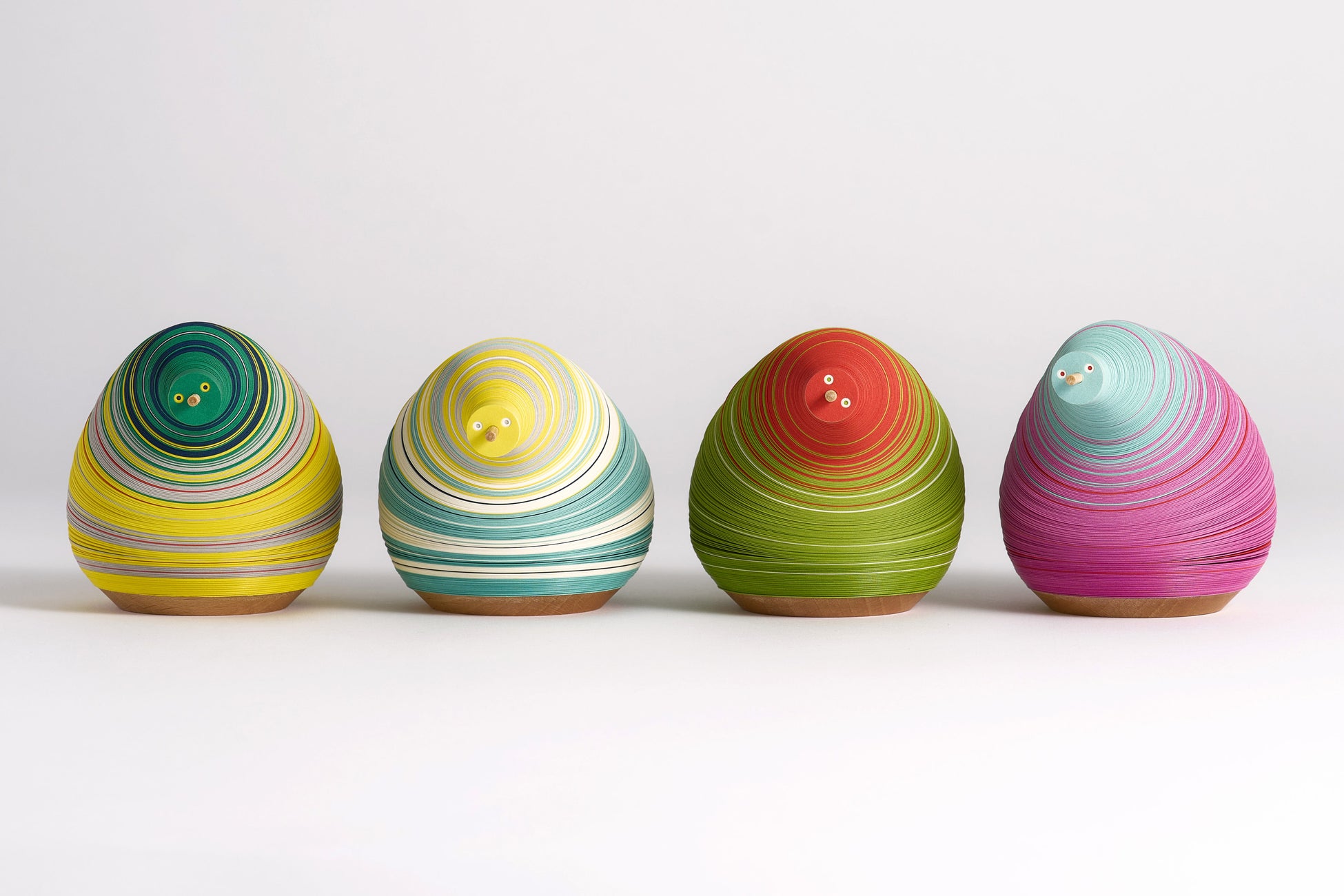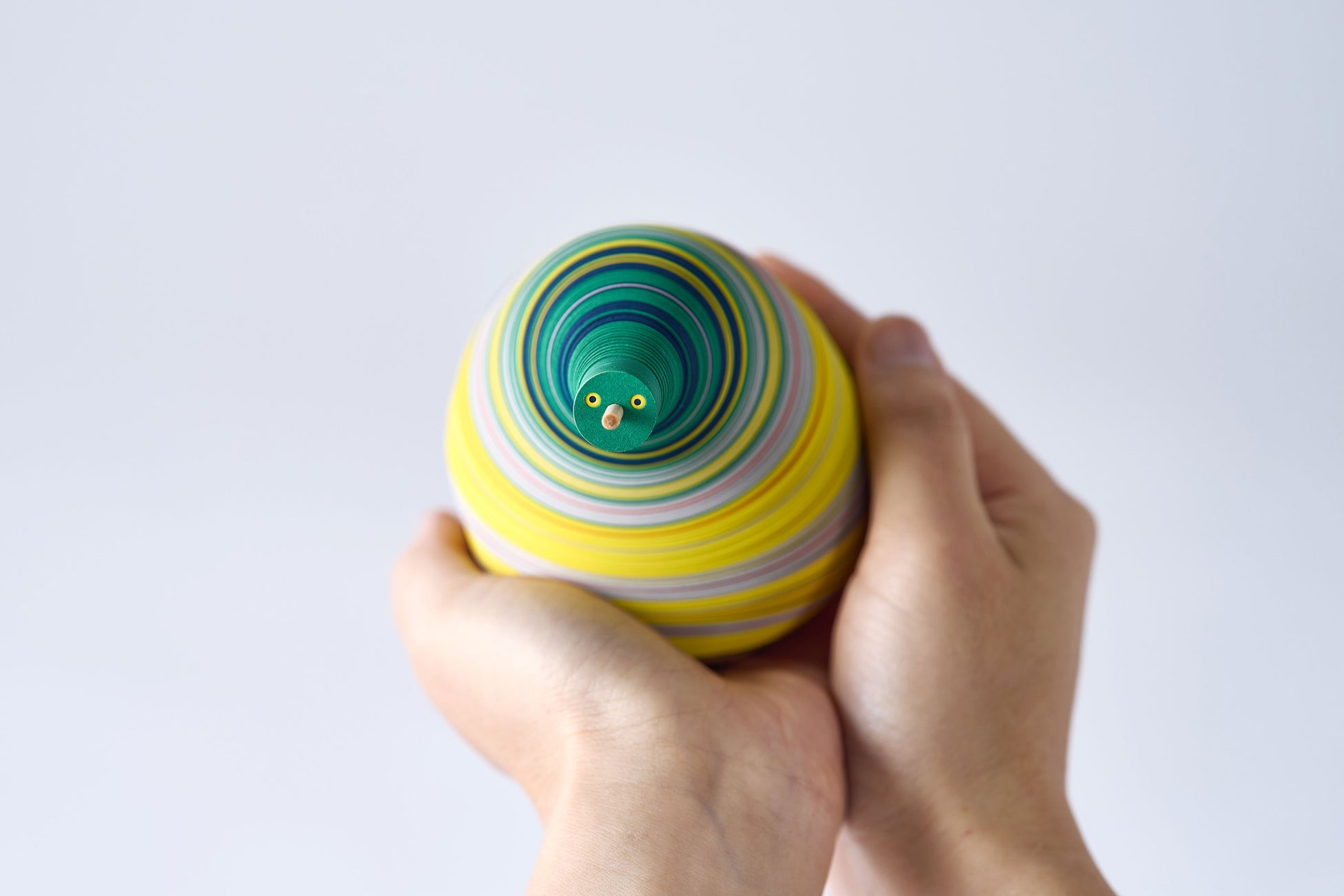 「PÉPET」は 1 匹あたり大小 400 枚余りの円でできています。 大きさの違う円を交互に重ねると、紙と紙の間に空間ができ、不思議な動きをもたらします。 また、その空間に影が落ちることでコントラストが生まれ、断面の色が際立ちます。