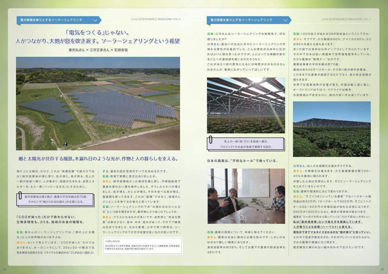 株式会社TERRA代表取締役 東光弘氏、東京大学 未来ビジョン研究センター教授 江守正多氏、株式会社Lond Holdings 代表 石田吉信氏による対談を掲載し、畑と太陽光発電が共存する風景をテーマに、持続可能なエネルギーと暮らしのあり方について語ります。再生可能エネルギーを通じた新しい社会の可能性を提示します。