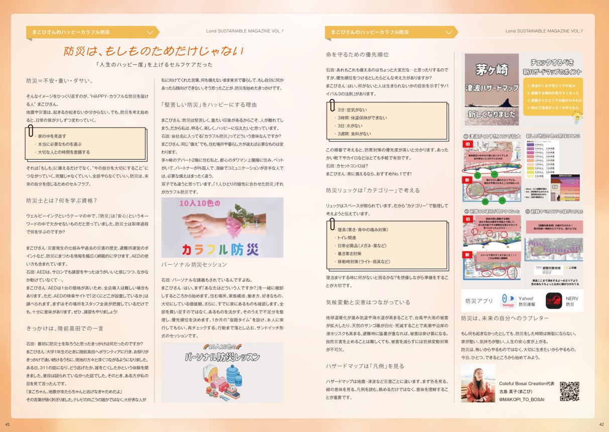 日常の中で自分や大切な人を守るための“セルフケア”として捉え直す、新しい防災のあり方を紹介します。colorful Bosai Creation 代表・古島真子(まこぴ)さんへの取材を通じて、「人生のハッピー度」を高める防災の考え方や、楽しみながら備えるための工夫についてお届けします。