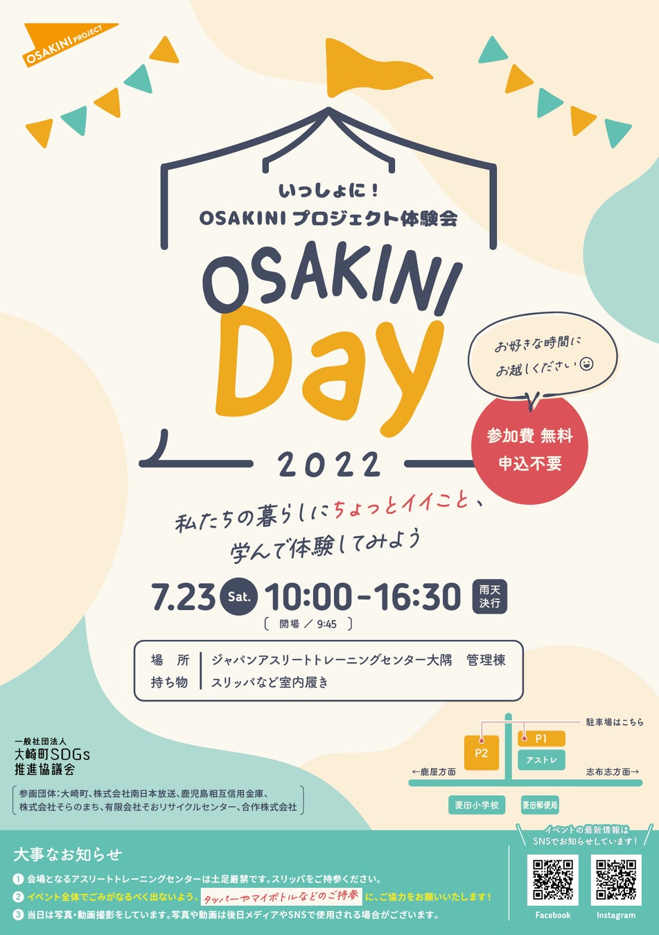一般社団法人大崎町SDGs推進協議会(所在地:鹿児島県大崎町 代表理事 千歳 史郎、以下大崎町SDGs推進協議会)では、「サーキュラーヴィレッジ」や「資源循環」などの大崎町SDGs推進協議会がこれから取り組むことを、聞いて、見て、体験するイベント「OSAKINI Day 2022」を7月23日(土)に開催します。