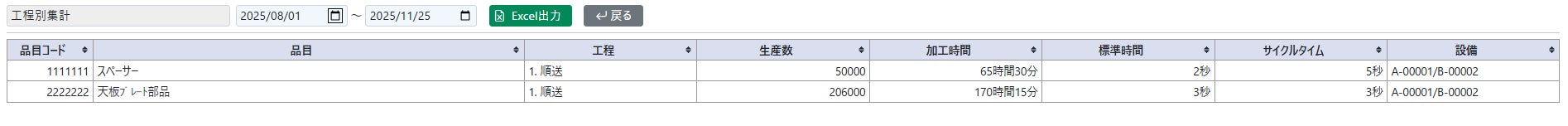 実績サイクルタイムを自動で算出し、標準時間との差を可視化します。工程間の差を比較し、ボトルネック工程を明確化することで、データに基づく改善活動への着手が可能です。