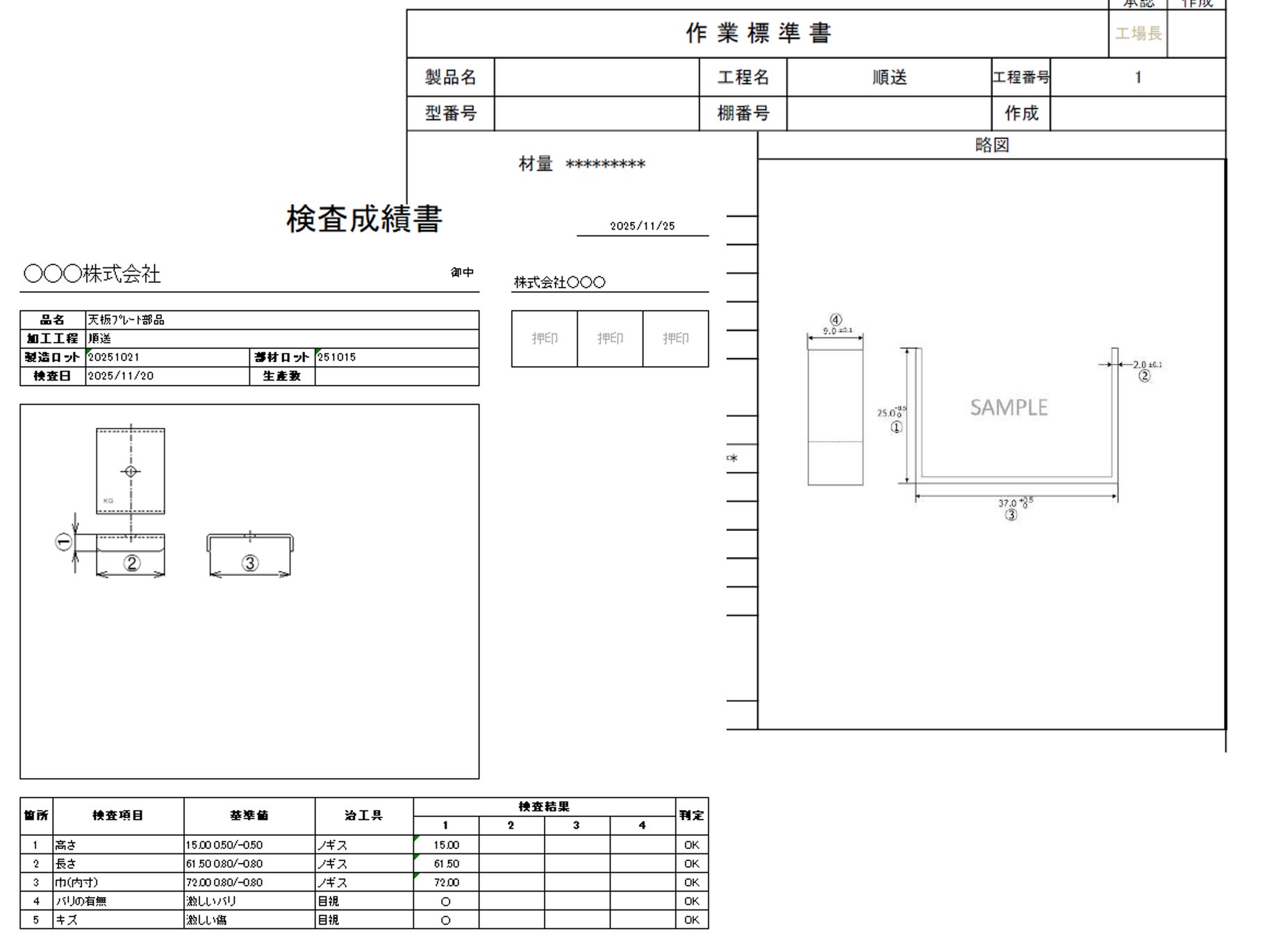蓄積された計測データから品質成績書をExcel形式で出力できます。手作業による転記ミスを排除し、工数を大幅に削減します。