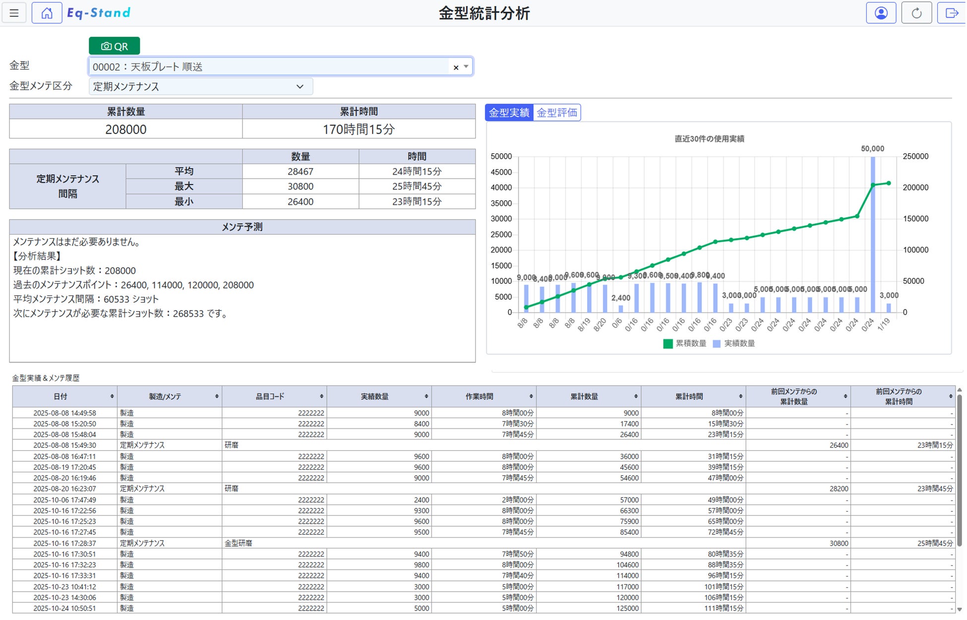 「Eq-Stand」は、製造メーカーである当社が、短納期・多品種・小ロットという厳しい生産環境の中で抱えていた課題を克服すべく、5年間かけて取り組んだDXの成果を結集したシステムです。品質管理を軸に、金型実績収集からの分析機能を提供し、設備保全業務の標準化を図ることができます。
