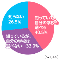 全国の高校生の男女に、女子制服で、スカートとスラックスを選べる学校があることを知っているかを尋ねたところ「知っていて、自分の学校も選べる」(40.5%)、「知っているが、自分の学校は選べない」(33.0%)をあわせると7割以上が知っていると回答していました。
