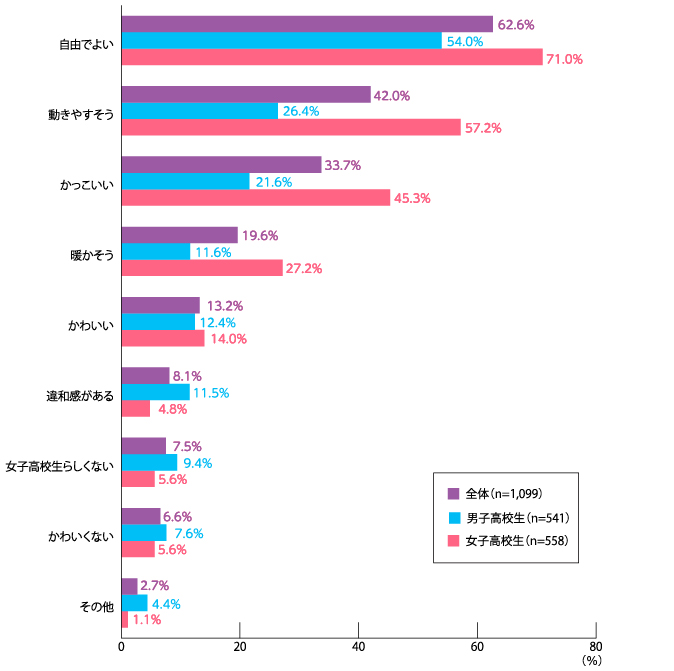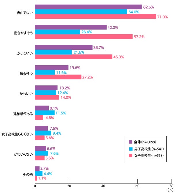 女子制服のパンツスタイル(スラックス)については、「自由でよい」(62.6%)、「動きやすそう」(42.0%)、「かっこいい」(33.7%)、「暖かそう」(19.6%)、「かわいい」(13.2%)というポジティブイメージが多い一方で、「違和感がある」(8.1%)、「女子高校生らしくない」(7.5%)、「かわいくない」(6.6%)といったマイナスイメージも少数ですが回答としてあげられました。