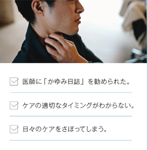 繰り返す「かゆみ」に悩まされる乾燥肌。大切なのが、肌の現状を把握して、その状態に合ったケアをすること。自分の肌状態と生活の質を合わせてモニタリングすることも大切と考えます。アプリではデバイスからのデータ以外にもセルフ診断で肌状態を記録。また、忘れてしまいがちな肌の状態も画像で記録しておくことで、経過をより客観的に理解できます。肌状態の推移を理解し、セルフケアにお役立ていただくことで患者さんの生活の質を向上します。