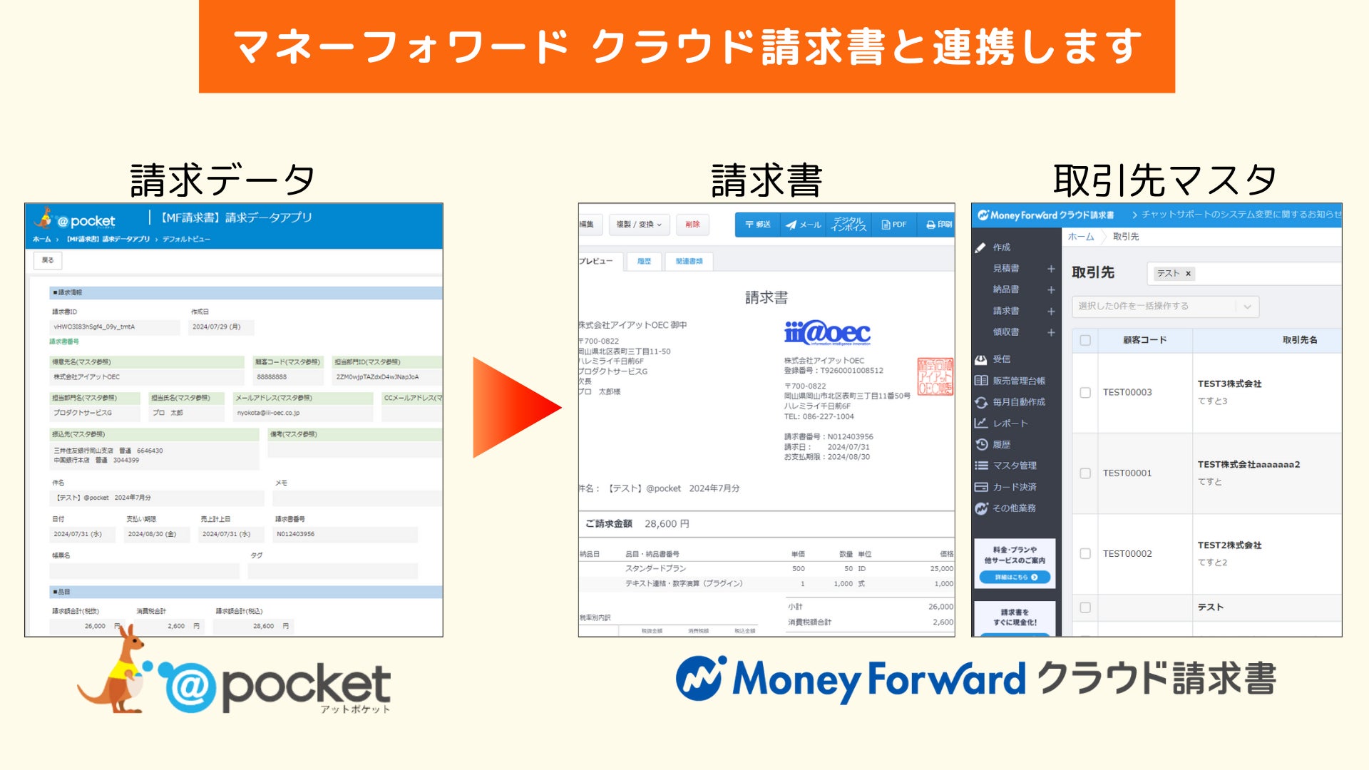 @pocketで作成した請求データをマネーフォワード クラウド請求書に連携できます。請求書データの共有は@pocketで行いつつ、請求書の一斉配信はマネーフォワード クラウド請求書で出来るようになります。
