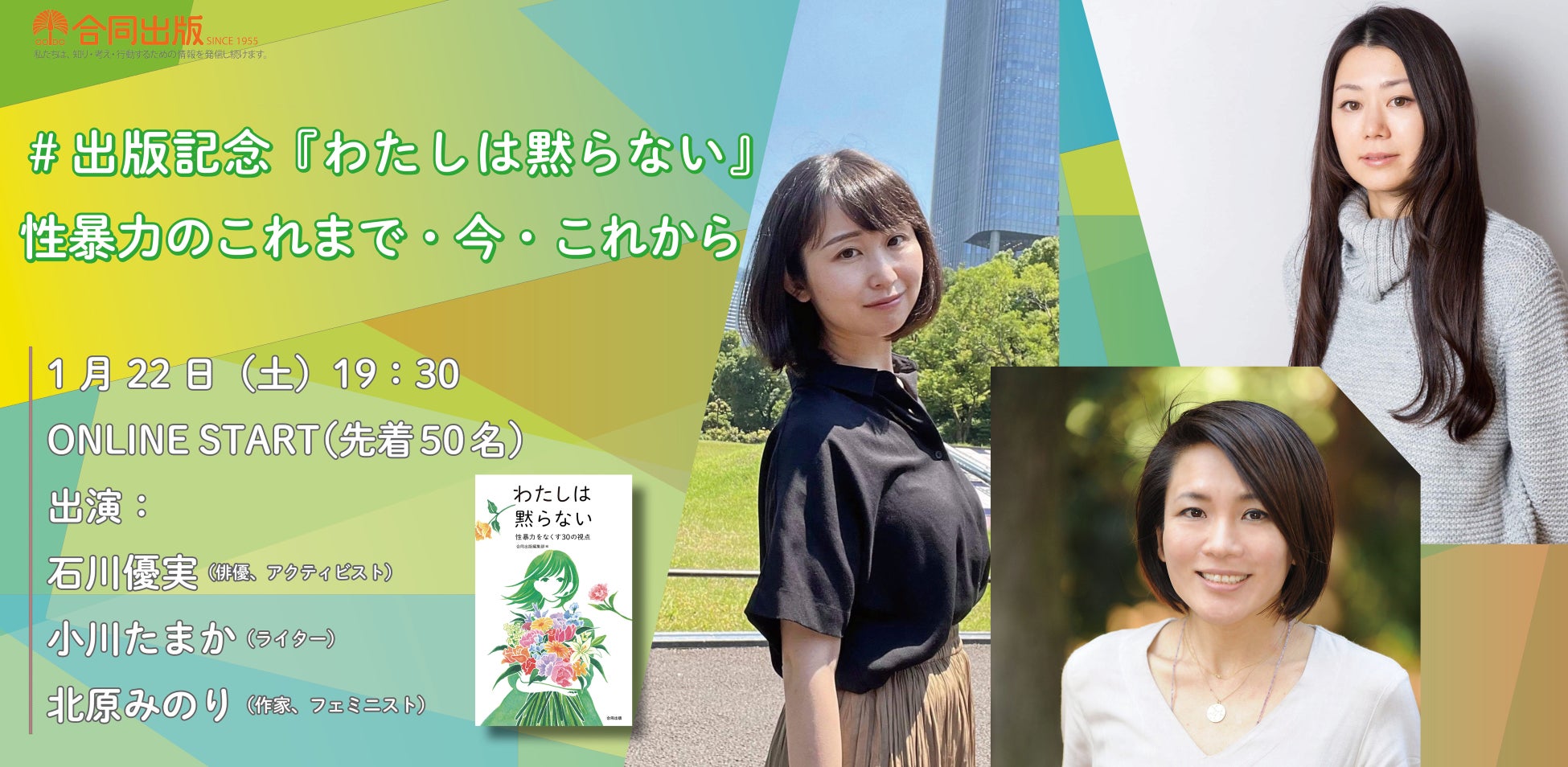 1月22日(土)にオンラインイベント「#出版記念『わたしは黙らない』性暴力のこれまで・今・これから」が開催されます。石川優実さん(俳優、アクティビスト)、小川たまかさん(ライター)、北原みのりさん(作家、フェミニスト)に性暴力のこれまで・今・これからについて鼎談していただきます。