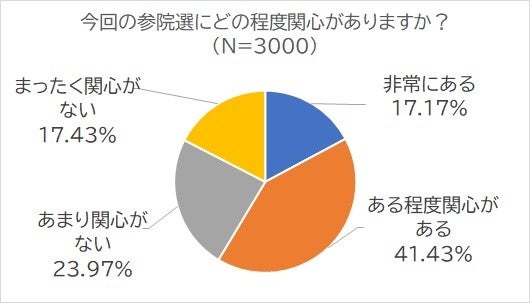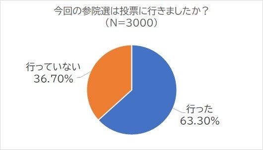 <設問1:今回の参院選は投票に行きましたか?>の質問に対し、63.30%が「投票に行った」と回答。また<設問2:今回の参院選にどの程度関心がありますか?>の問いでは、「非常にある」「ある程度関心がある」の合計は58.60%に達しました。