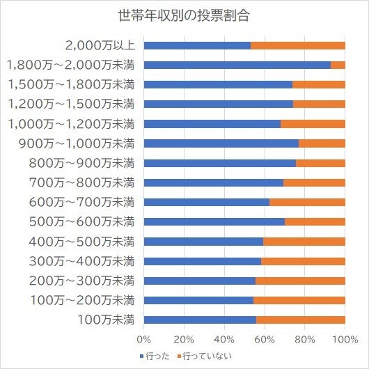 なお、投票に行ったかどうかを世帯年収別でみると、2000万円以上を除き、年収が上がるにつれて概ね投票した割合が高くなる傾向がみてとれました。