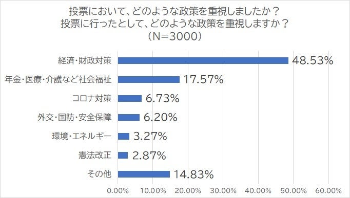 <設問3:投票において、どのような政策を重視しましたか?また投票しなかった人は、仮に投票に行ったとして、どのような政策を重視しますか?>では、経済・財政対策が48.53%で最多。ダントツで他を大きく引き離しました。