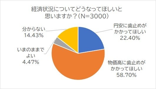 そこで、さらに<設問4:今回の選挙結果を受け、経済状況についてどうなってほしいと思いますか?>を質問。「円安に歯止めがかかってほしい」が22.40%だった一方、「物価高に歯止めがかかってほしい」が58.70%で、生活に直結する問題の解決を望んでいることが浮き彫りとなりました。