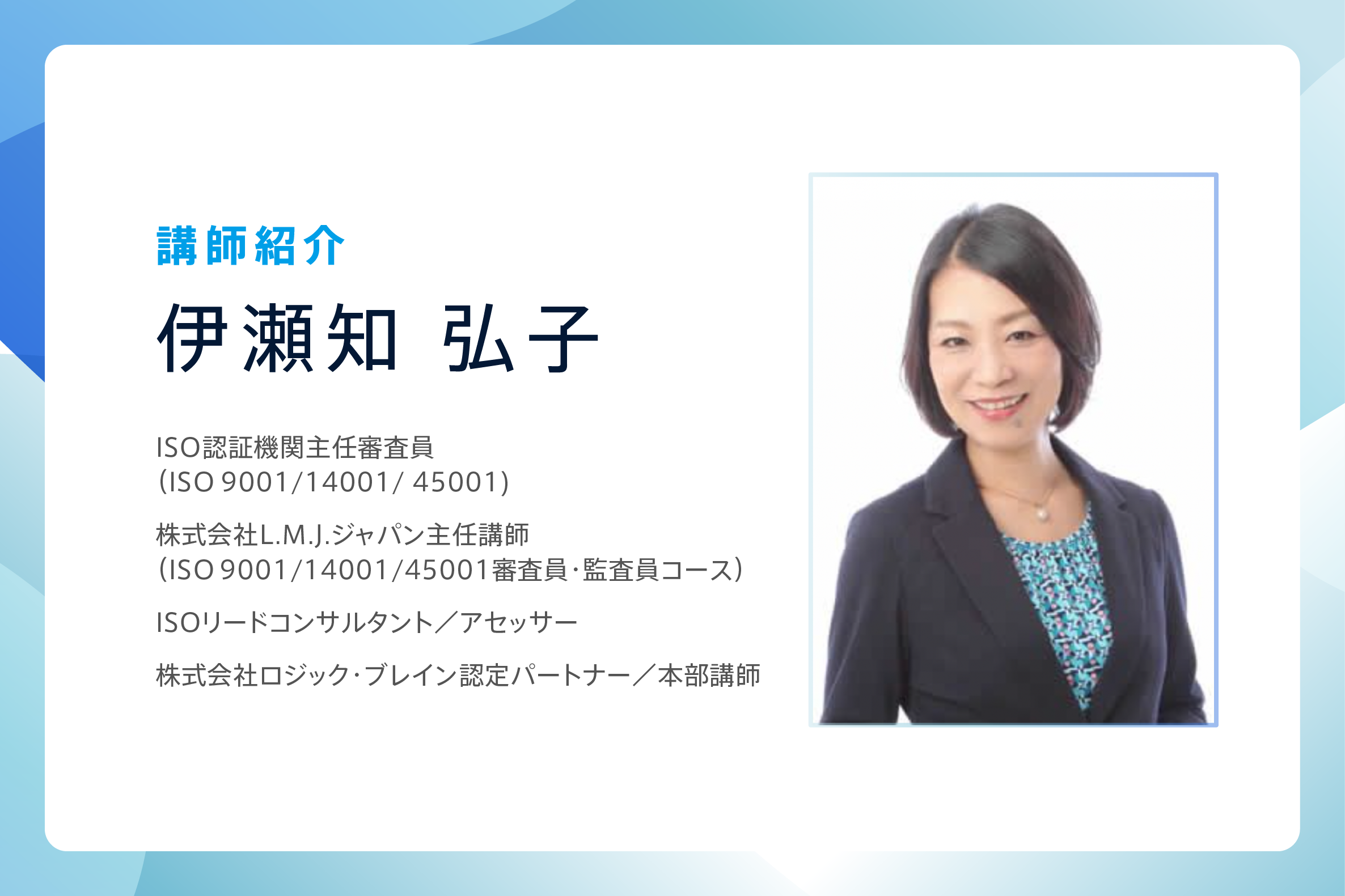 審査実績は200社以上。株式会社L.M.J.ジャパンのISO内部監査員講座の講師やISO認証取得を目指す企業のコンサルティング業務に従事。