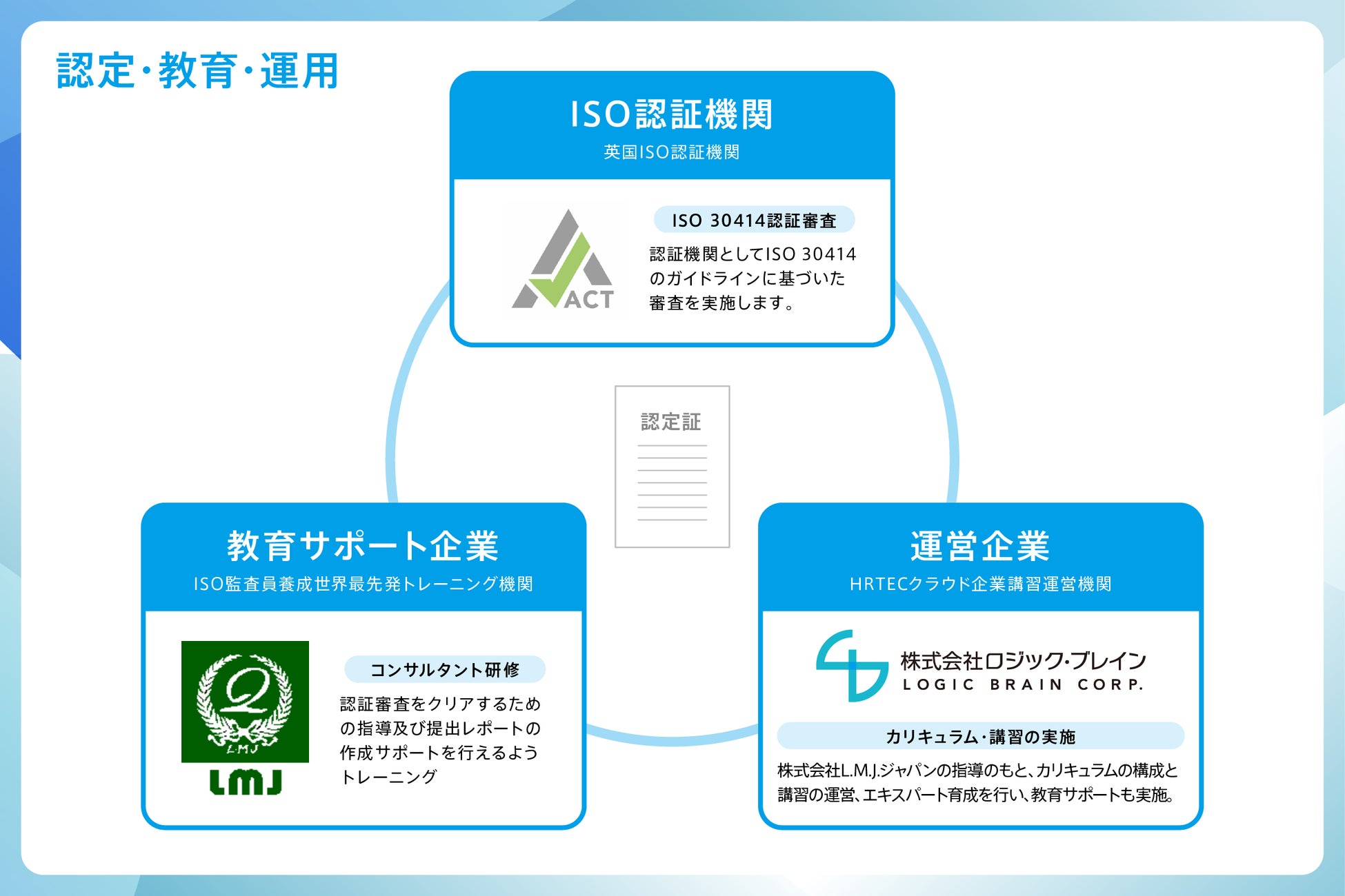 我々ロジック・ブレインは、人的資本に重きを置いたマネジメントツールTOiTOiを運用する立場から、国内企業の資本価値を高める活動を行うべく、L.M.J.ジャパンが認定を行う資格「ISO 30414人的資本マネジメントエキスパート」取得のための講習を行うこととなりました。ISO 30414に関する講座開催は日本で2社目であり、英国の認証は日本初となります。