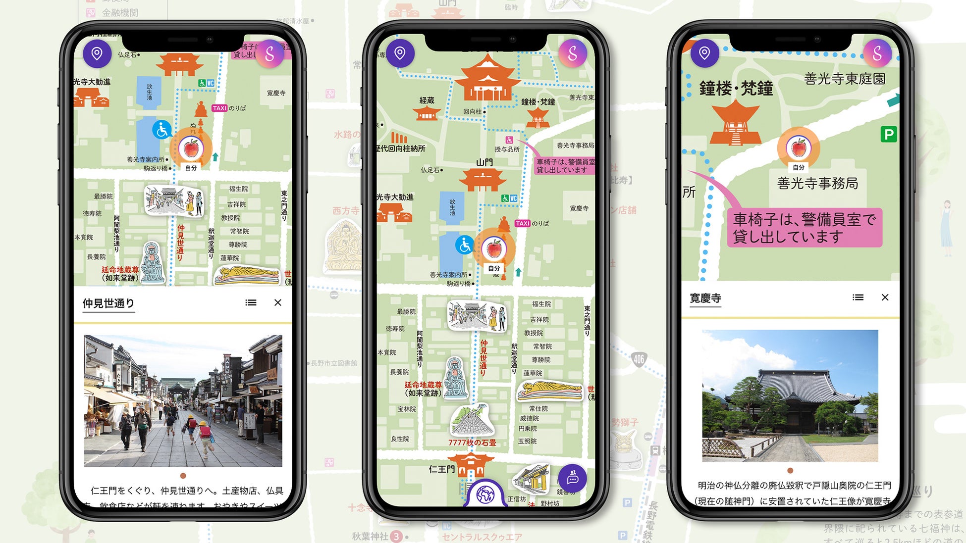 前回の「御開帳」が実施された2015年には、約700万人以上の参拝客が訪れるなど、今年も多くの観光客が予想されています。そうした中で、善光寺境内、また周辺の飲食店や観光スポットの情報をマップ上で打ち出すことで、周遊及び地域振興への貢献を目指してまいります。