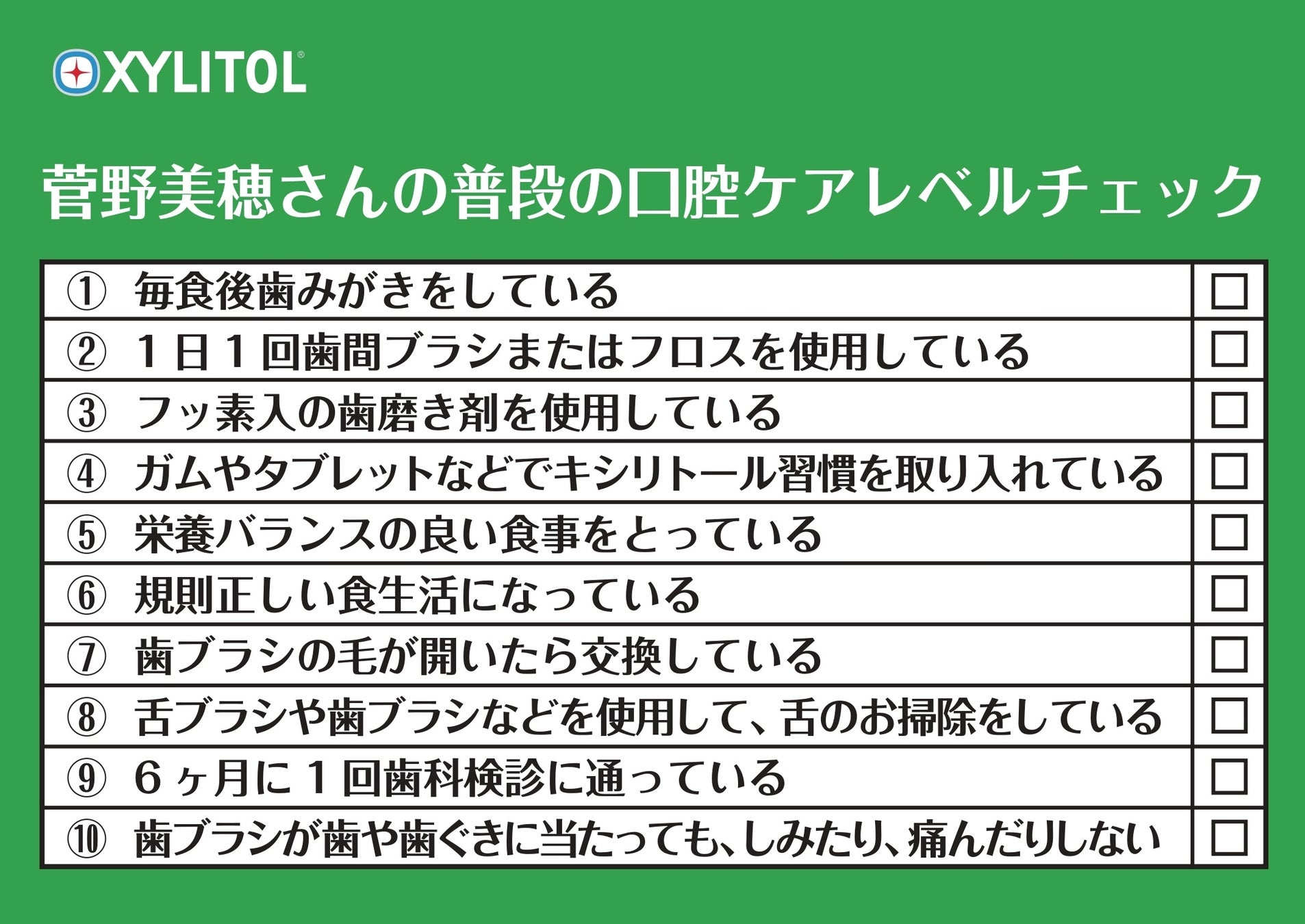 新CMキャラクターである菅野さんが普段、どのような口腔ケアを行えているか、そのレベルを抜き打ちでチェク。10項目(図ご参照)が何個当てはまるか、その場で菅野さんに行ってもらいました。