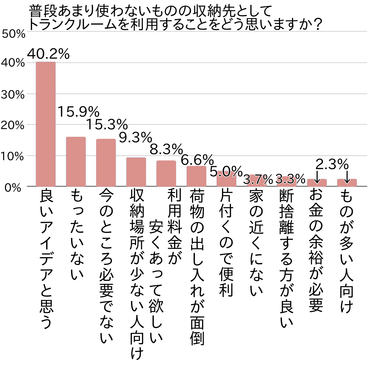 トランクルームを利用することについて、良いアイデアだと感じた方は40.2%で第1位でした。ただし、収納場所が少ない家に住む方なら良い、荷物が多い・大きい方なら良いと条件付きで良いと答える方が多く、その背景には「自分自身は関係ない」と感じている場合がほとんどでした。