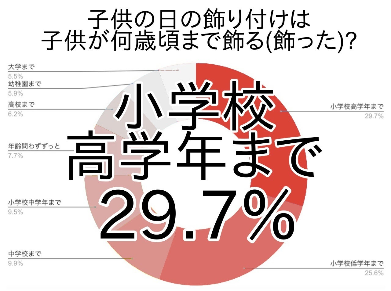 アンケートでは、「小学校高学年まで」の方が第1位で約3割(29.7%)を占め、第2位の「小学校低学年まで(25.6%)」・第4位の「小学校中学年まで(9.5%)」と合わせて小学校頃まで飾ると答えた方が合計64.8%となりました。小学校で興味を持って喜んでくれる間・大きくなっても記憶に残る頃まで飾り、中高生になると忙しさ等から減ってくる傾向にあるようです。
