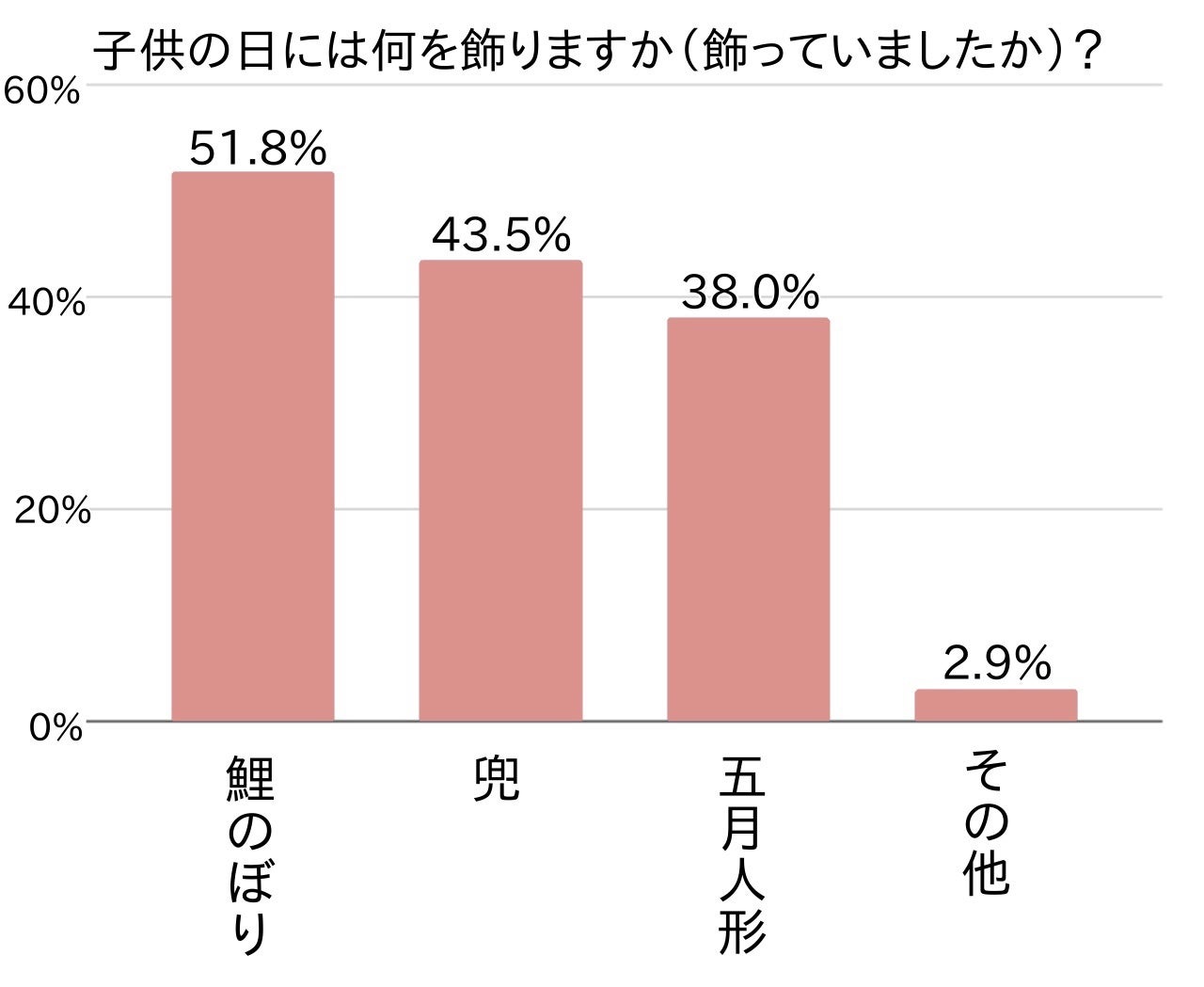 第1位は「鯉のぼり」で約5割(51.5%)を占めました。鯉のぼりを挙げた理由として多かったのは、鯉のぼりが子供の日の代表格というイメージが強いこと、五月人形や兜と比べ女の子のお祝いにも飾りやすいこと、工作で作ったりおもちゃで買えたり、小さくて簡易的なものも多いことでした。中には、地域の各家庭で大きな鯉のぼりを飾るのが風習なので毎年地域みんなで飾っているという方も複数見られました。