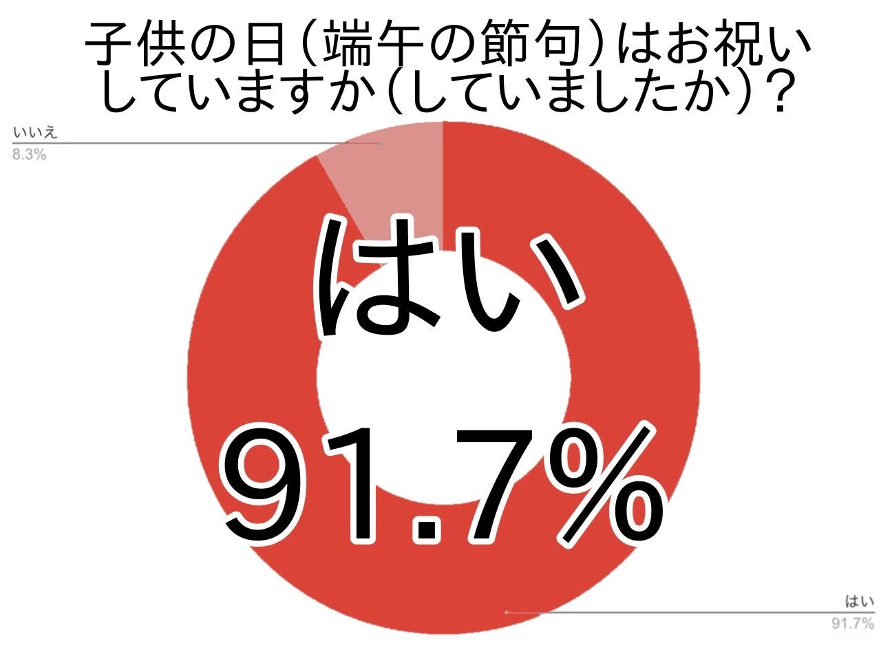 今回のアンケートでは、子供の日に端午の節句の飾り付けをする・していたと答えた方は91.7%でした。男の子のお子様がいらっしゃるご家庭はもちろんですが、そうでない場合にも、恒例行事として鯉のぼり等を飾ったりする方が多いようでした。子供の日が日本人の生活に深く浸透している伝統ある年中行事であることが伺えます。このあとのアンケートでも、日本の伝統を大切にし、季節感を感じて子供の日を祝っていることがよく分かる結果となっているので、詳しくお伝えしていきましょう。