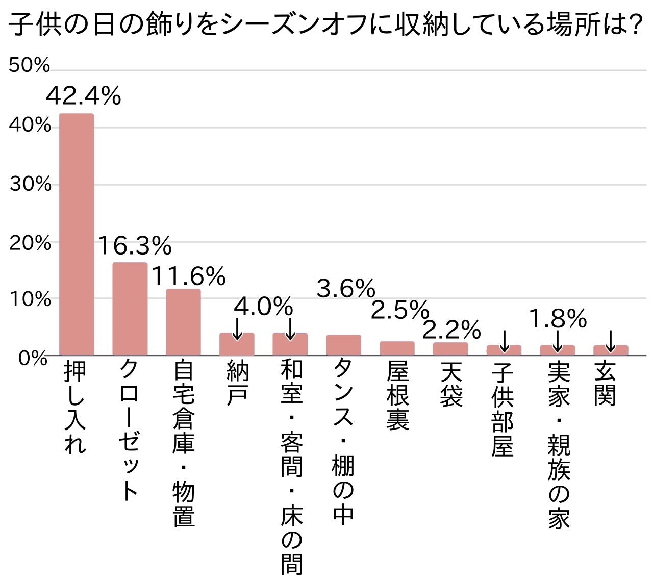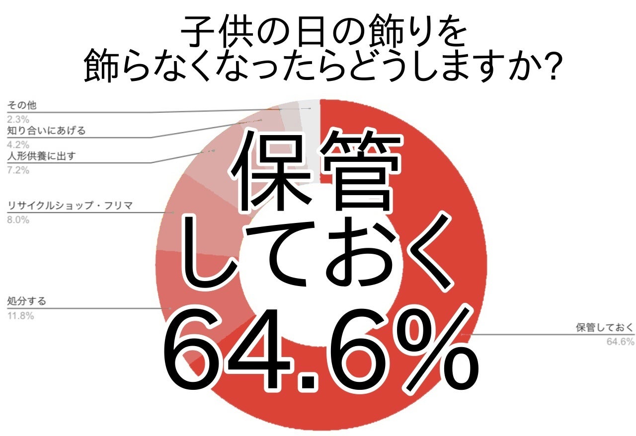 しかも、押し入れ(雛・48.0%、子・42.4%)、クローゼット(雛・15.3%、子・16.3%)、自宅倉庫・物置(雛・8.8%、子・11.6%)と比率もかなり類似していました。なお、子供の日の飾りを自宅倉庫・物置に収納する割合がやや多かったのは、屋外に鯉のぼりを飾る方が自宅内よりは倉庫・物置に収納したいと考えることが多い影響が現れています。