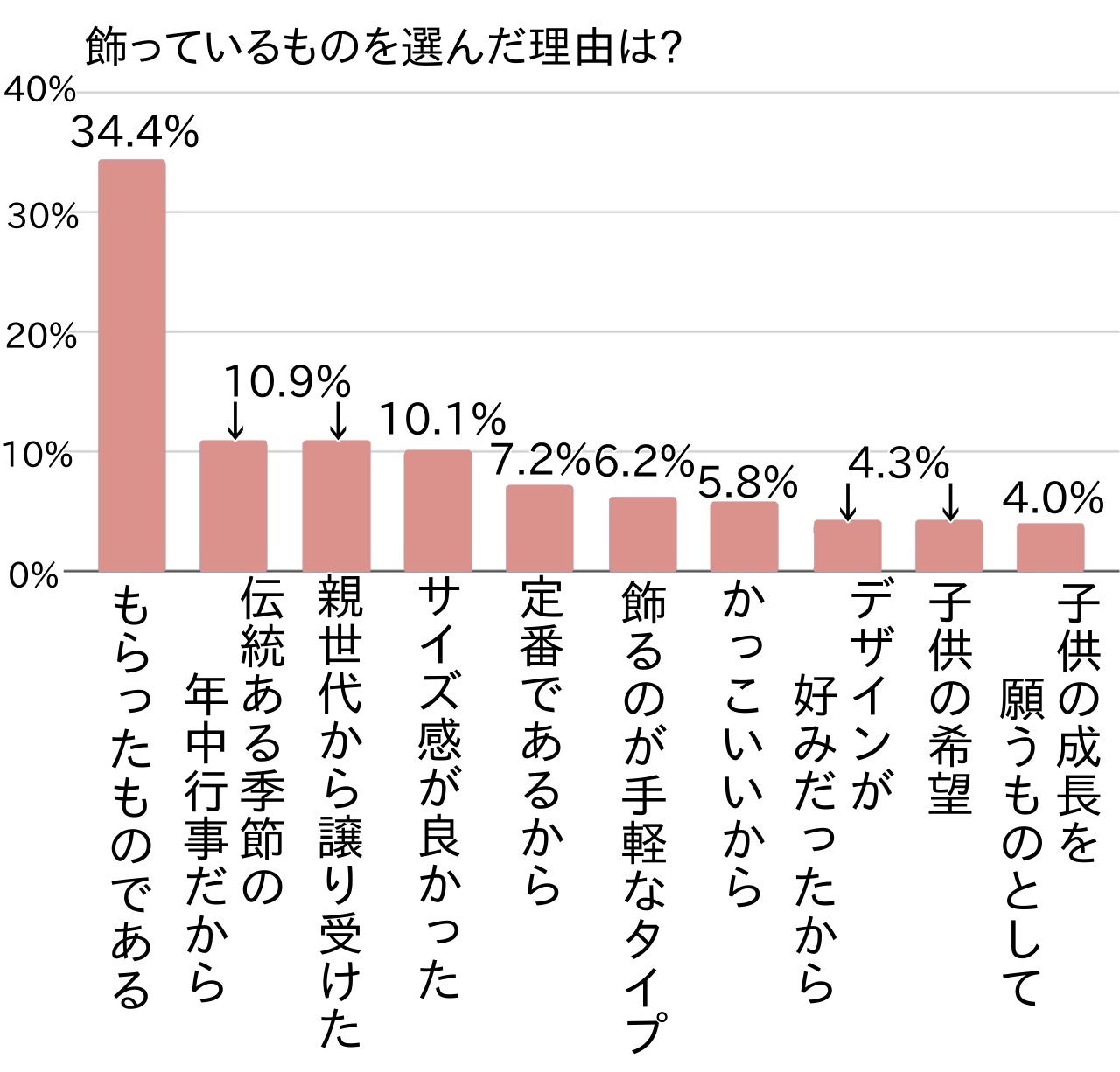 自分たちで選んで購入する(または買ってもらう)場合にも、好みというよりは「子供の日らしさ」で選ぶ傾向がありました。伝統ある季節の年中行事にふさわしいもの(10.9%)と感じて購入した方、定番であるスタイルのもの(7.2%)を選んだ方、子供の成長を願うものとしてふさわしいもの(4.0%)と考えて選んだ方が多く見られました。