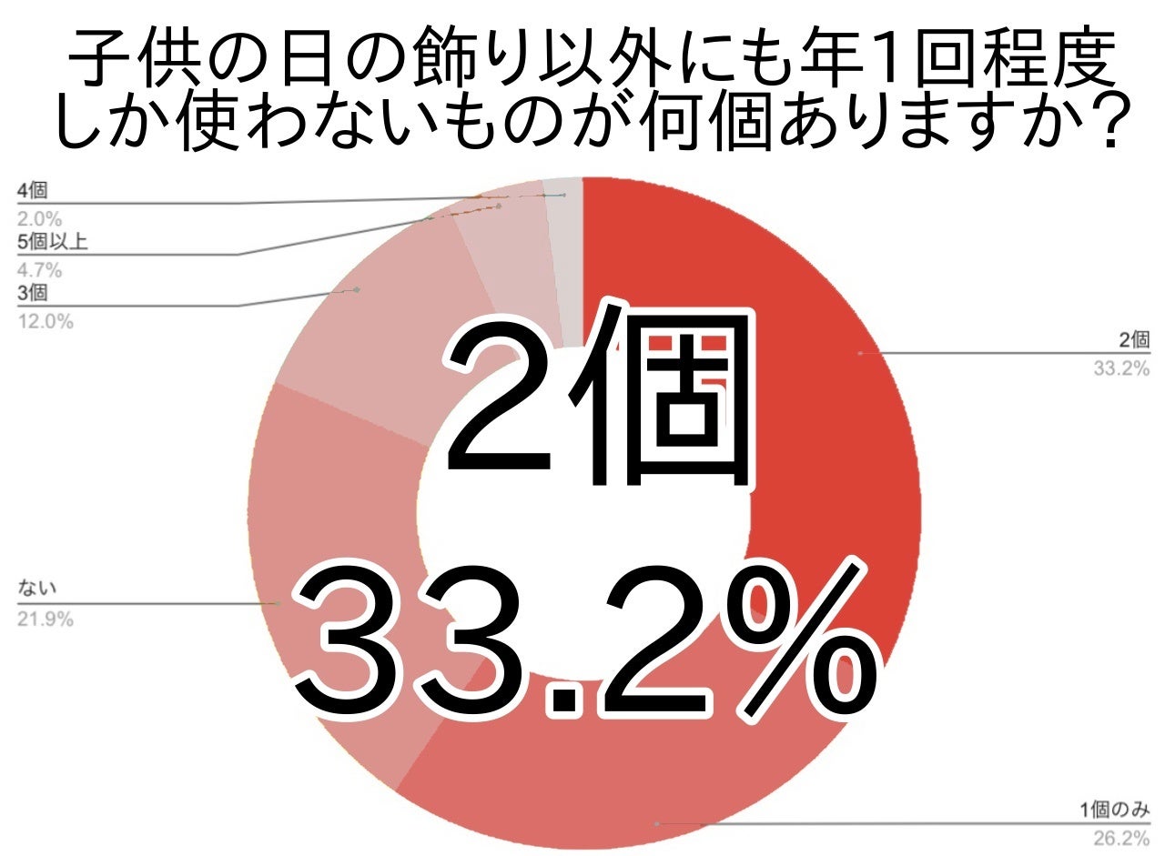 子供の日を大切にする人は、季節感や節目を大切にする傾向があるようです。子供の日以外にも年に一度程度しか使わない飾り等がある方は合計で約8割(78.1%)もおり、そのうち2個と答えた方が約3割(33.2%)、1個と答えた方が3割弱(26.2%)でした。