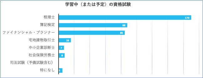 職員が取り組んでいる、または取り組む予定としている資格試験の勉強について聞いたところ、「税理士」と回答した人は全体の約43%にあたる166人、「簿記検定」と答えた人が87人、「ファイナンシャルプランナー」と答えた人が85人でした。