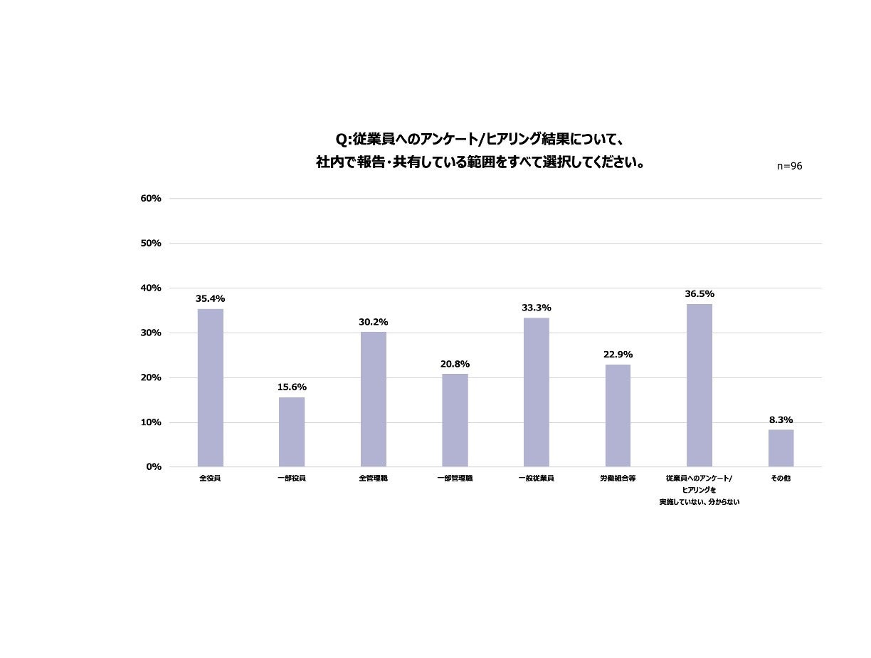 社内アンケート結果の共有範囲について尋ねたところ、36.5%の企業が「従業員へのアンケート/ヒアリングを実施していない、または状況を把握できていない」と回答。