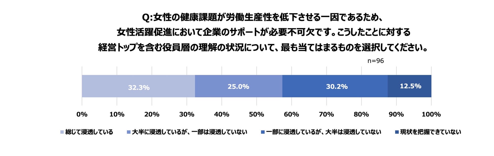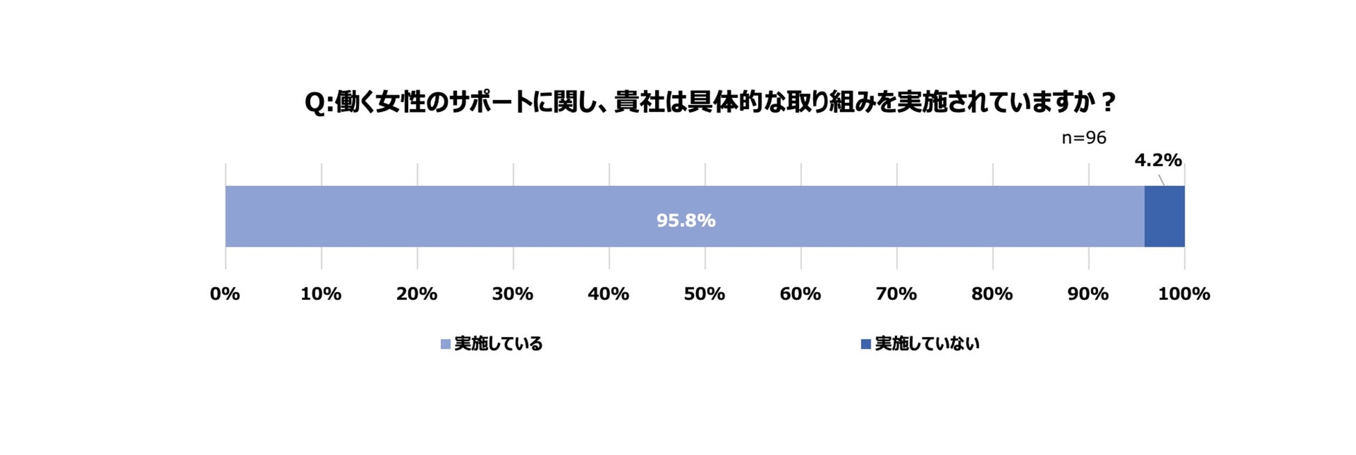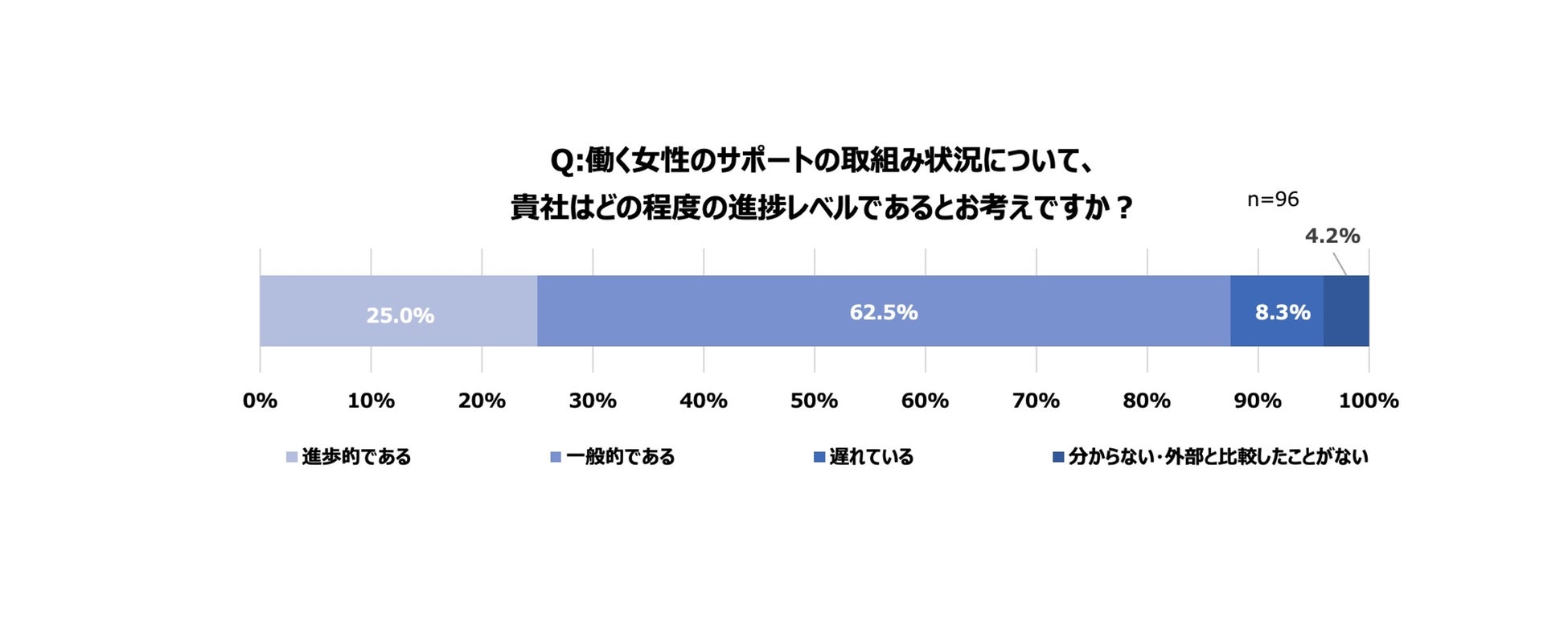 95.8%の企業が⼥性の健康⽀援を実施。しかし、⼥性へのサポート状況を「進歩的である」と評価したのはわずか25.0%に留まる。