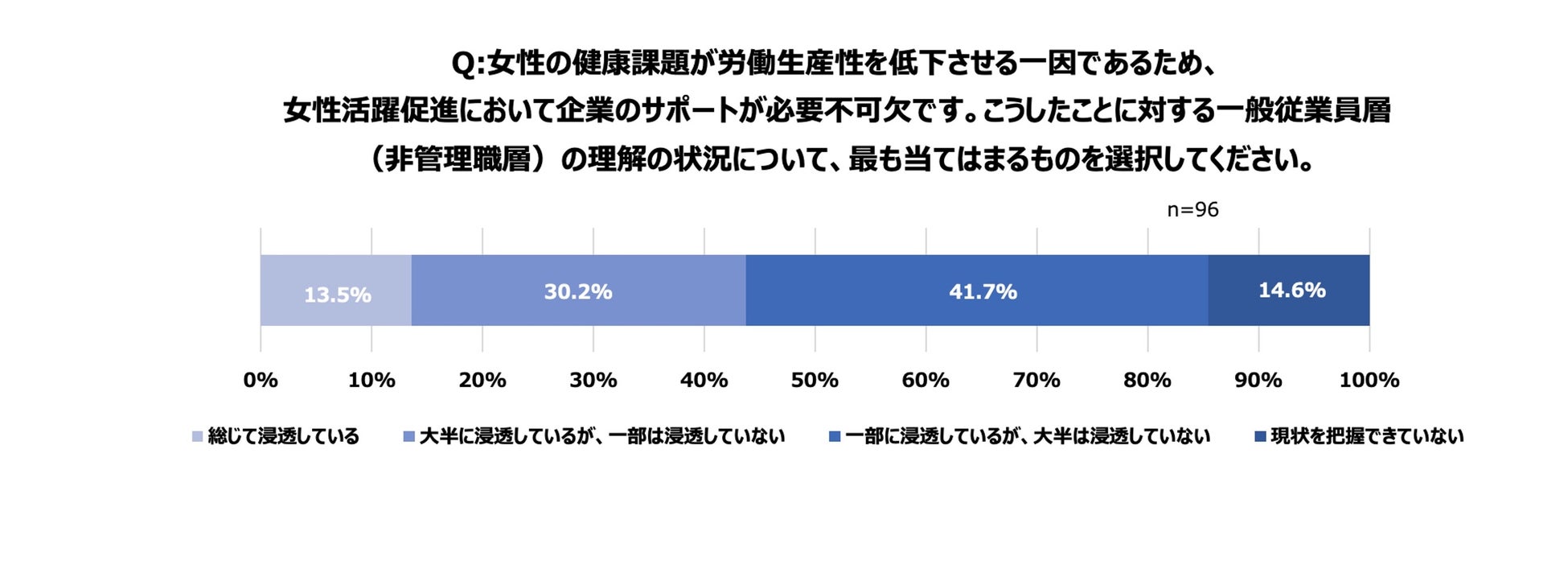 企業に対し、女性の健康支援に対する経営層および一般従業員層の理解度について尋ねたところ、経営層の32.3%が「総じて浸透している」と回答しました[図6]。しかし、一般従業員層では「一部に浸透しているが、大半は浸透していない」(41.7%)が最多となりました[図7]。この結果から、企業側は「支援が十分に行き届いている」と認識している一方で、現場で実際に支援を受ける従業員の実感は乏しいことが明らかになりました。トップ層の「実施できている」という感覚と、現場の「実感がない」というギャップを埋めるためには、双方向のコミュニケーションが不可欠です。