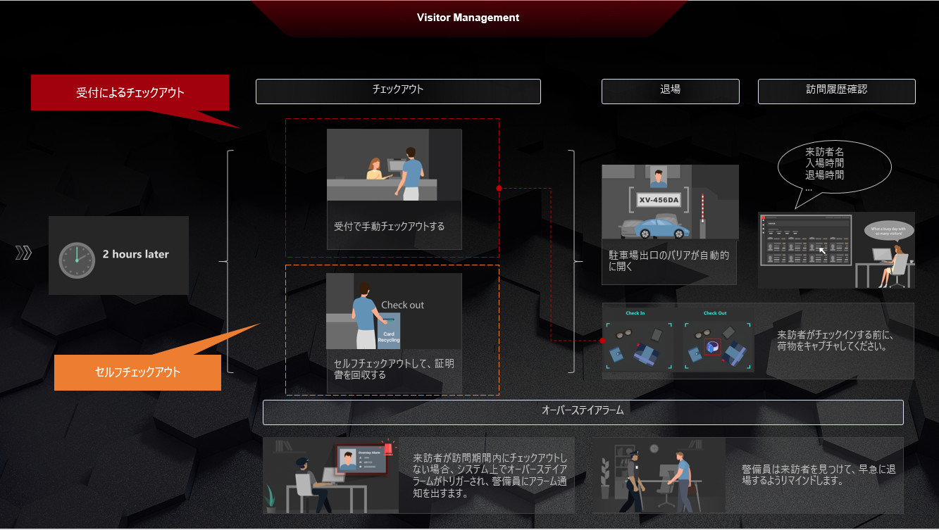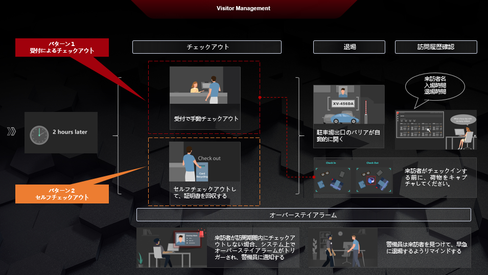 訪問者が訪問期間を過ぎてもチェックアウトしなかった場合、システムはタイムアウトアラームをトリガーして管理者に通知し、管理者はパトロール担当者を手配して、該当訪問者を見つけて早急に退館するよう注意します。