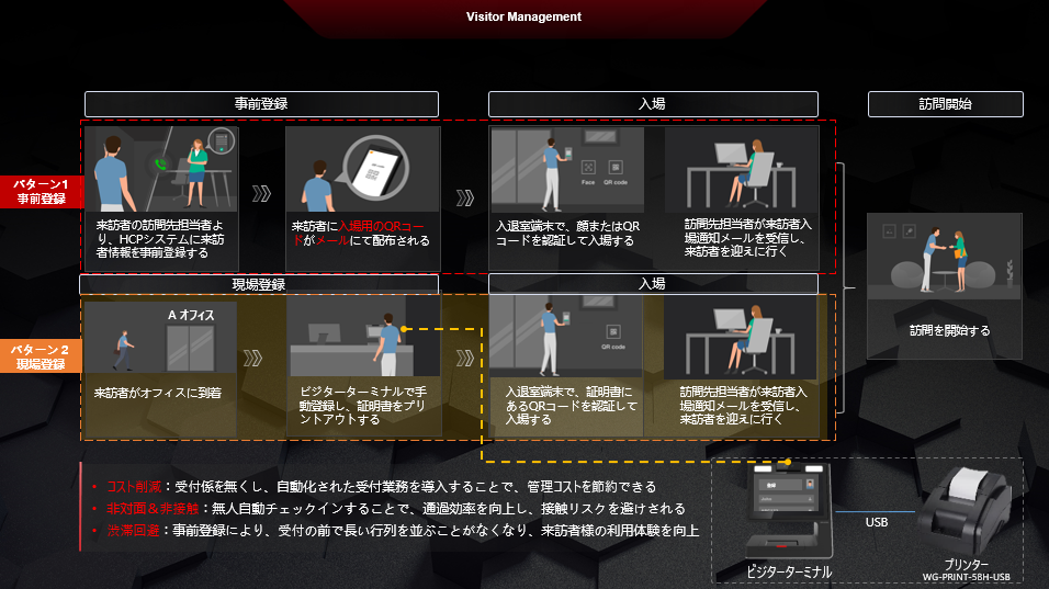 来訪者は弊社のビジターターミナル上で自分自身が来訪情報(名前、連絡先、メールアドレス、訪問エリア、訪問時間帯)を登録します。登録完了後、プリンターと連携して訪問証明書をプリントアウトします。来訪者は、証明書に記載されたQRコードを認証して入館します。