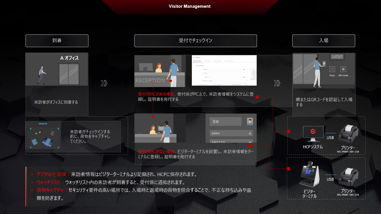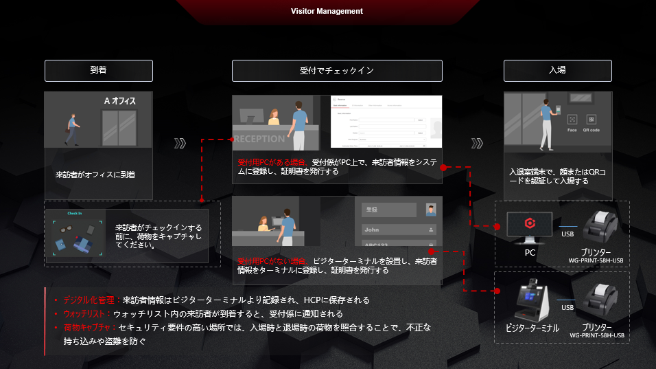 2:より良いサービスを実現するために、ウォッチリスト機能も提供しています。管理者よりVIPリストとブラックリストを事前に設定できます。来訪者がチェックインすると、システムは来客情報を検知し、通知を出すことができます。