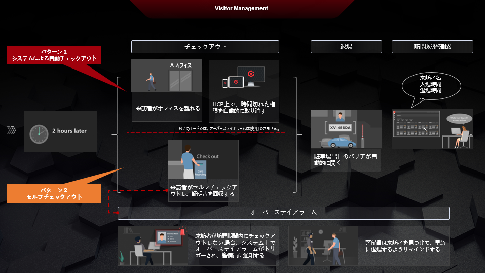 ①システムによる自動チェックアウト:来訪者がチェックアウトせずに直接退館する