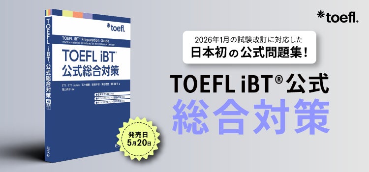 ETS Japan(東京都千代田区:カントリーマネージャー 塩崎 修健)と教育出版の株式会社旺文社(東京都新宿区:代表取締役社長 粂川 秀樹)は、2026年1月からスタートしている改訂版TOEFL iBT®に対応した公式問題集「TOEFL iBT®公式総合対策」を5月にリリースいたします。