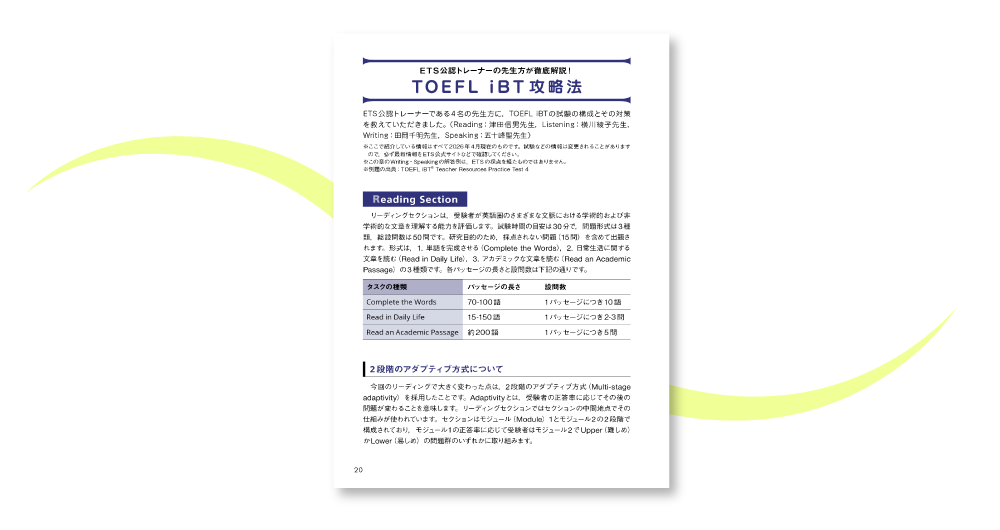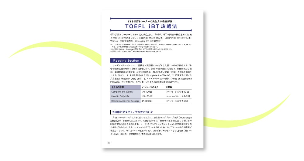 本書は、2026年1月21日の改訂内容に対応した公式TOEFL iBT®対策に特化した、日本語としては初となる公式総合対策書です。