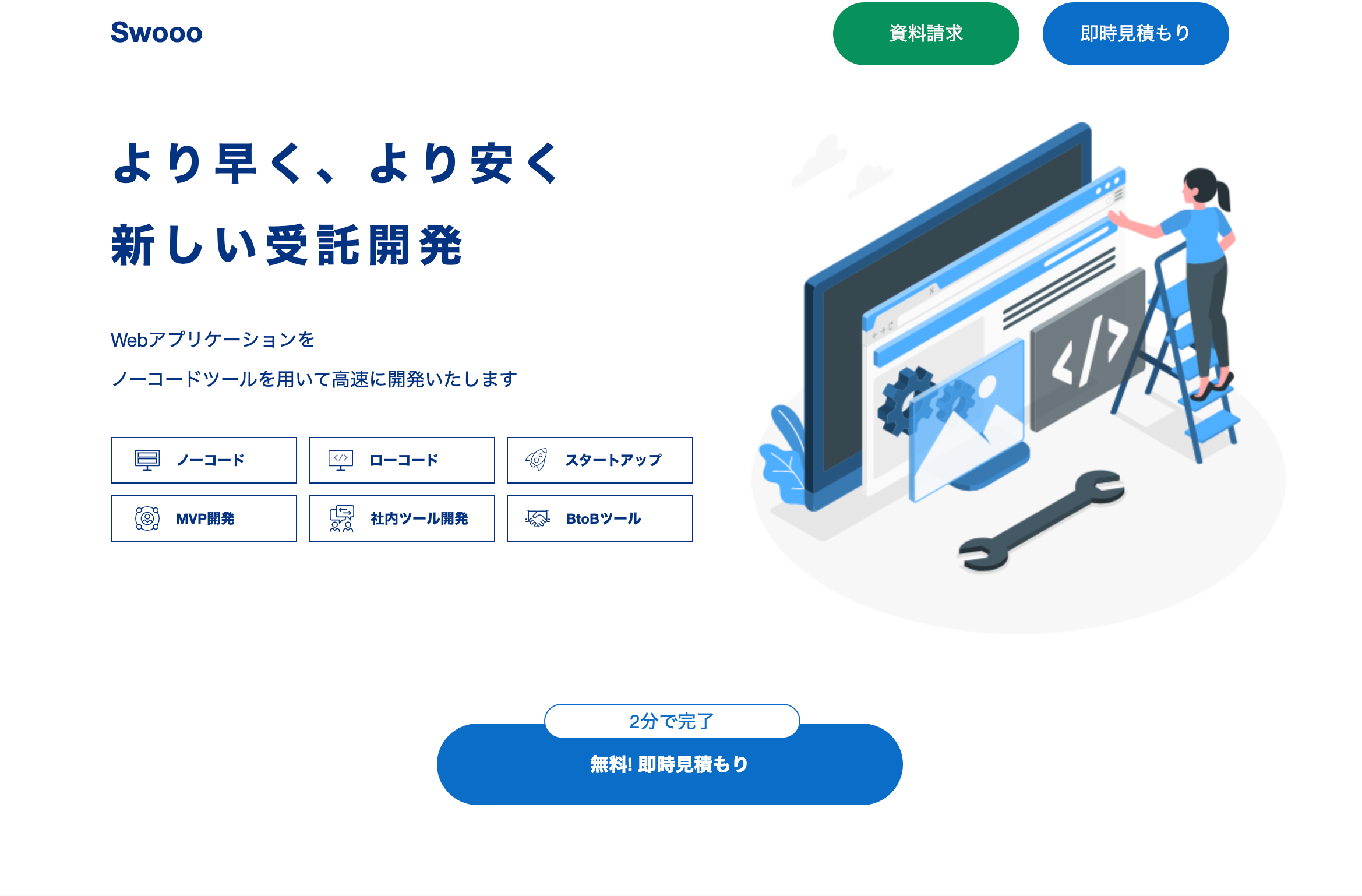 Swoooは、「コーディング不要のノーコードツールを活用し、従来よりもコストを抑え、そして早く実現させる」webシステム開発サービスです。