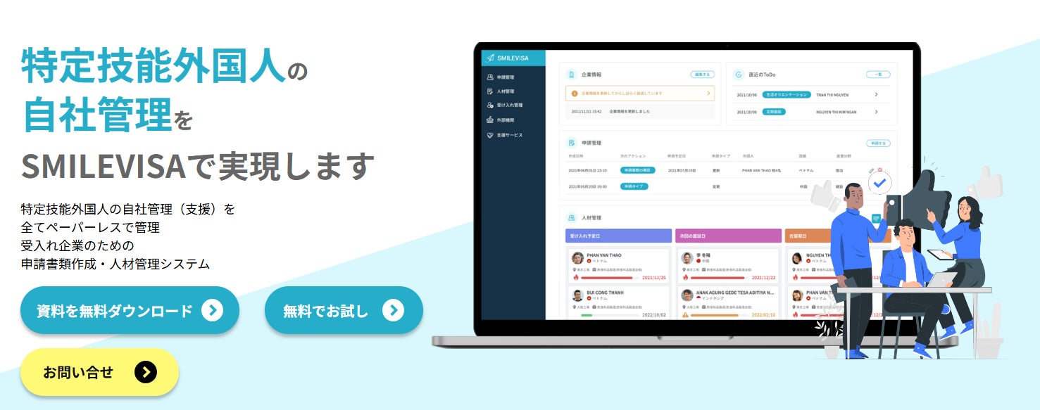 「SMILEVISA」は、特定技能外国人の在留資格申請や、受け入れ管理に必要となる各届出書などの作成、人材管理(入退社、在留期日など)をするためのクラウドサービスです。
