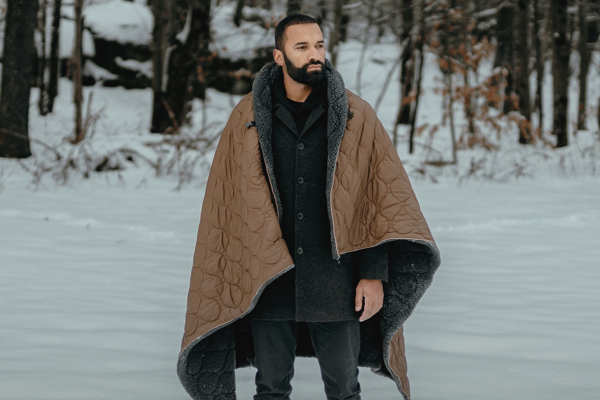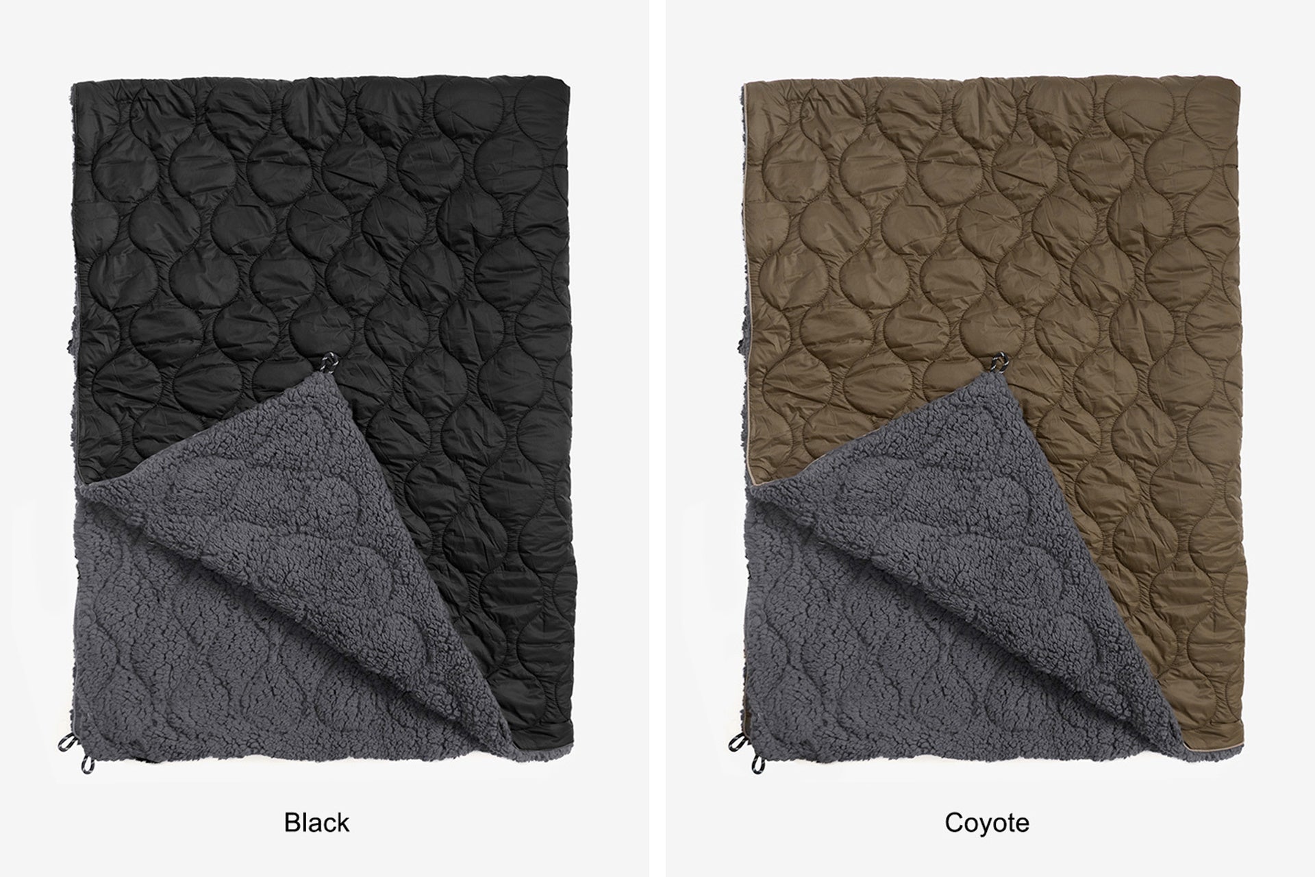 シェルパフリースを裏地に使用したエコダウン(シンセティックダウン)のパフブランケット。廃棄されたペットボトルをリサイクルしたポリエステル糸から作られています。