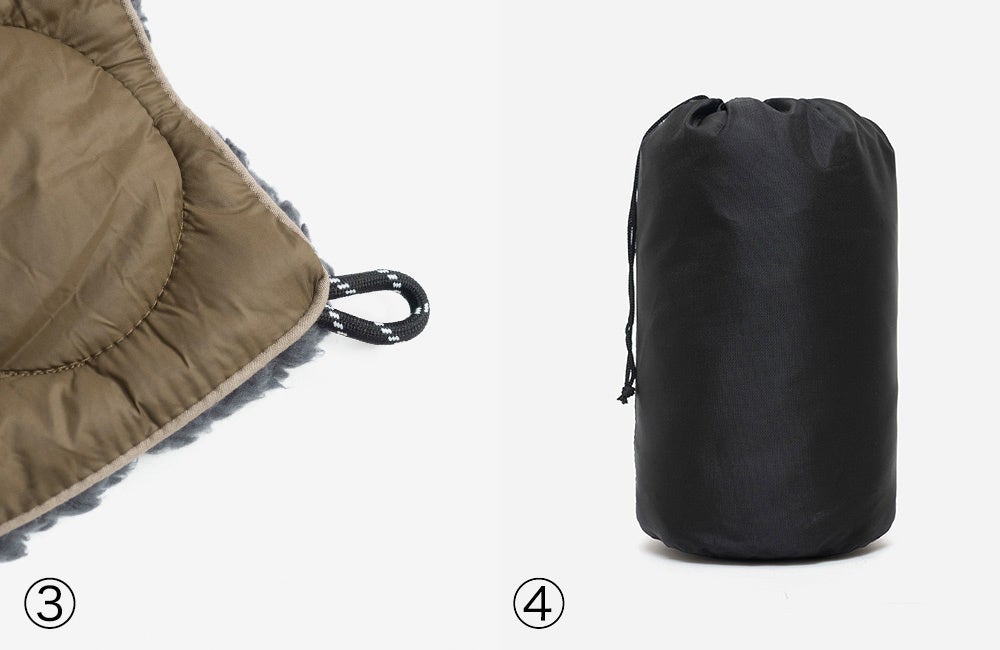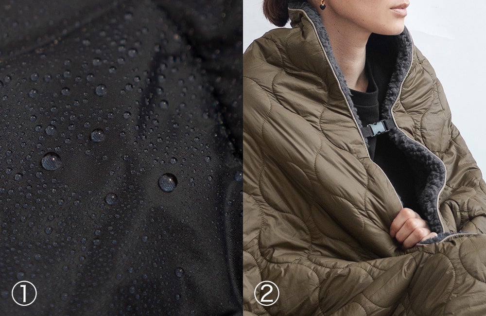表面は撥水加工が施され、ポンチョの様に着用頂けるケープクリップを備える等、アウトドアでの就寝時だけ使う寝袋に比べ、自宅でやピクニックなど幅広いシーンで活用頂ける他、冬場の寝袋だけでは不安な寒い時期も一緒に使うと安心です。
