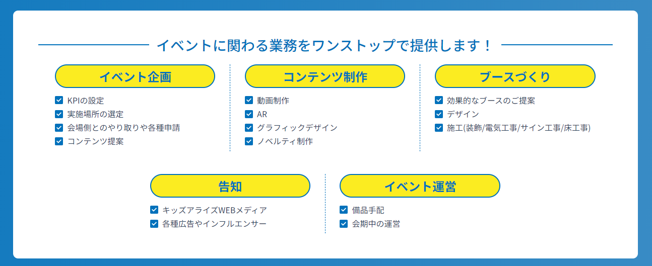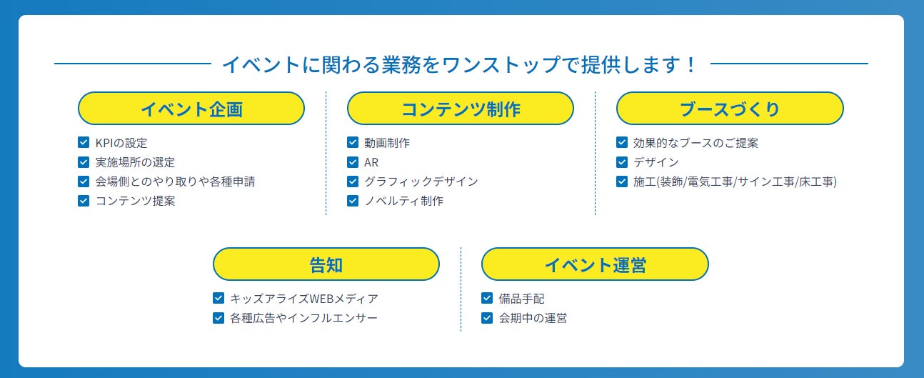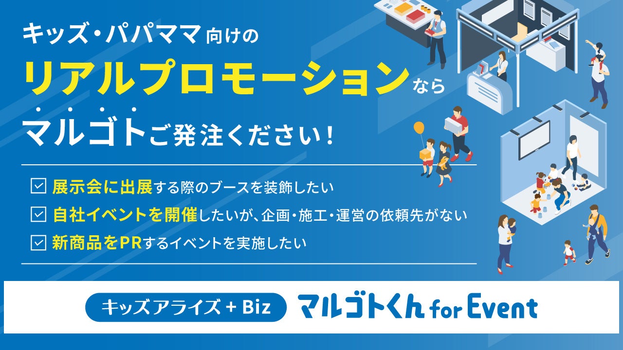 キッズアライズが、BtoBソリューションサービス「キッズアライズ +Bizマルゴトくん for Event」の提供を開始しました。イベントの企画支援や、展示会ブースの施工・運営などイベントの開催や出展時に必要な業務をワンストップで実施いたします。