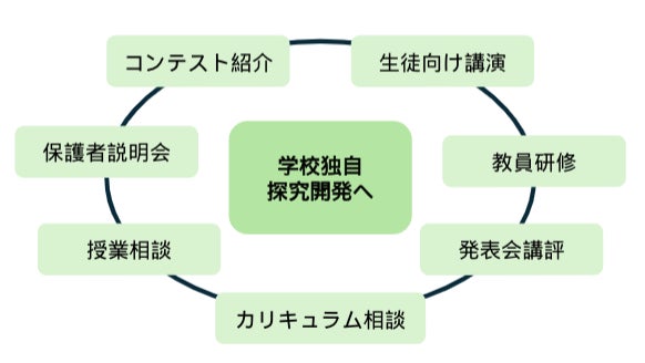カリキュラム相談や授業相談に加え、コンテスト情報の紹介や教員研修、生徒向け講演や講評、保護者説明会など幅広くサポートを行います。