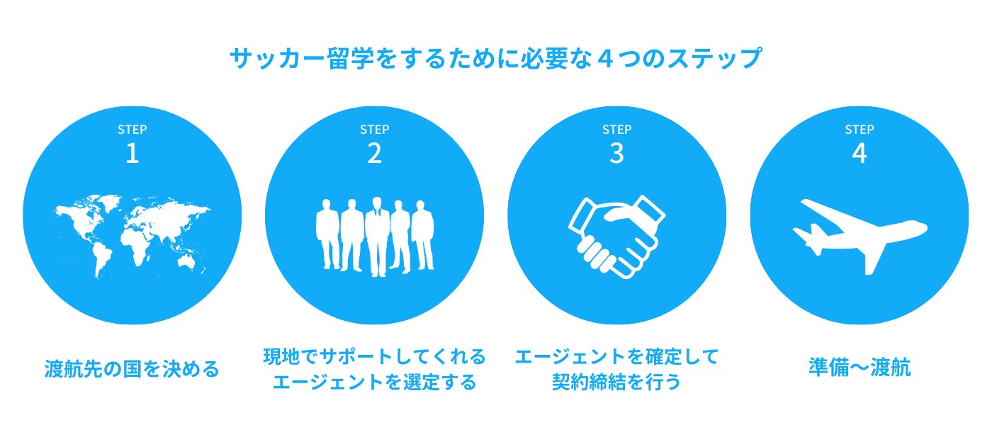 エージェントと契約を締結した後、エージェントが、現地コーディネーター、受け入れ先(現地クラブ)とのやり取りや宿泊先の手配、渡航期間に応じてビザの申請手続き等、渡航までに必要な準備をサポートしてくれます。そして渡航後は現地コーディネーターのサポートを受けながら留学生活を送っていくことになります。
