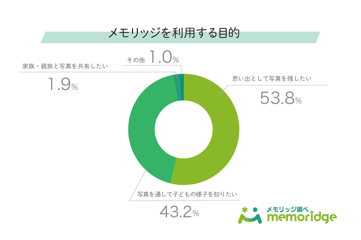 写真には「日々の様子を知るため」と「思い出として残すため」という2つの使い方があることは、これまでの調査でも示唆してきたが、今回「思い出として残したい」が53.8%で最も高かった点は、その傾向が定量的に確認された形と言える。一方で「子どもの様子を知りたい」も43.2%と高く、メモリッジが“今の姿を知るため”と“あとで振り返るため”の両方の目的で利用されていることが分かる。また「家族と共有したい」が1.9%と少ない点は、閲覧の主な動機が“誰かに見せること”ではないことを示している。ただし共有という行動自体は一定数あるため、これは目的ではなく、結果として行われることが多いという理解が自然である。