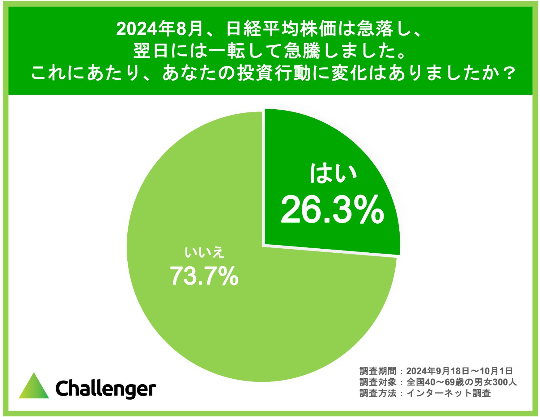 そうした中、資産運用を行う、ミドルシニア世代と呼ばれる40〜69歳の方300人を対象に、2024年8月の日経平均株価の急落、急騰に対する、投資行動への変化の有無について調査を実施したところ、26.3%の方が「変化があった」と回答しました。