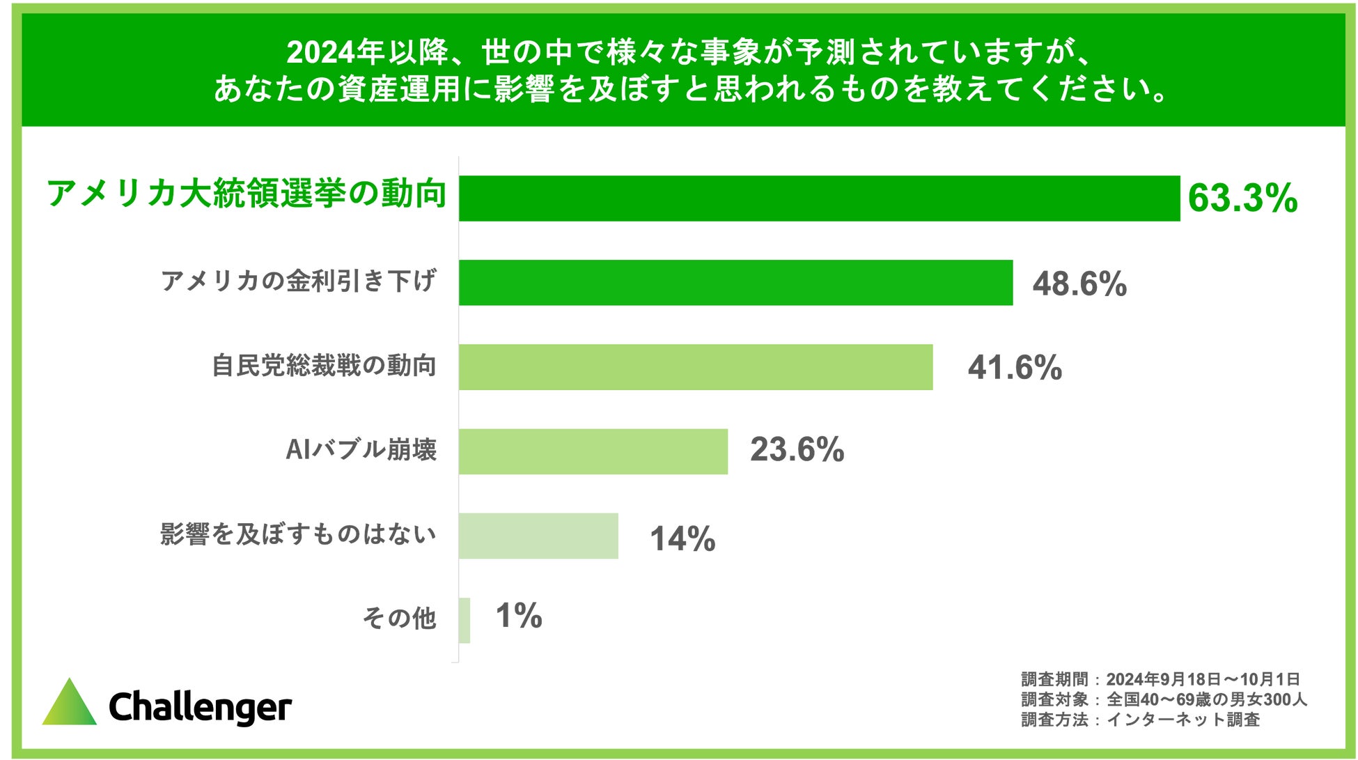 2024年10月以降、国内・国外を含め、さまざまな出来事が起こることが予想されています。そうした中、今後起こり得る事象に対して、資産運用に影響を及ぼすと思われるものについて聞いたところ、最も多い回答は「アメリカ大統領選挙の動向(63.3%)」となりました。次いで、「アメリカ金利引き下げ(48.6%)」が多い結果となりました。