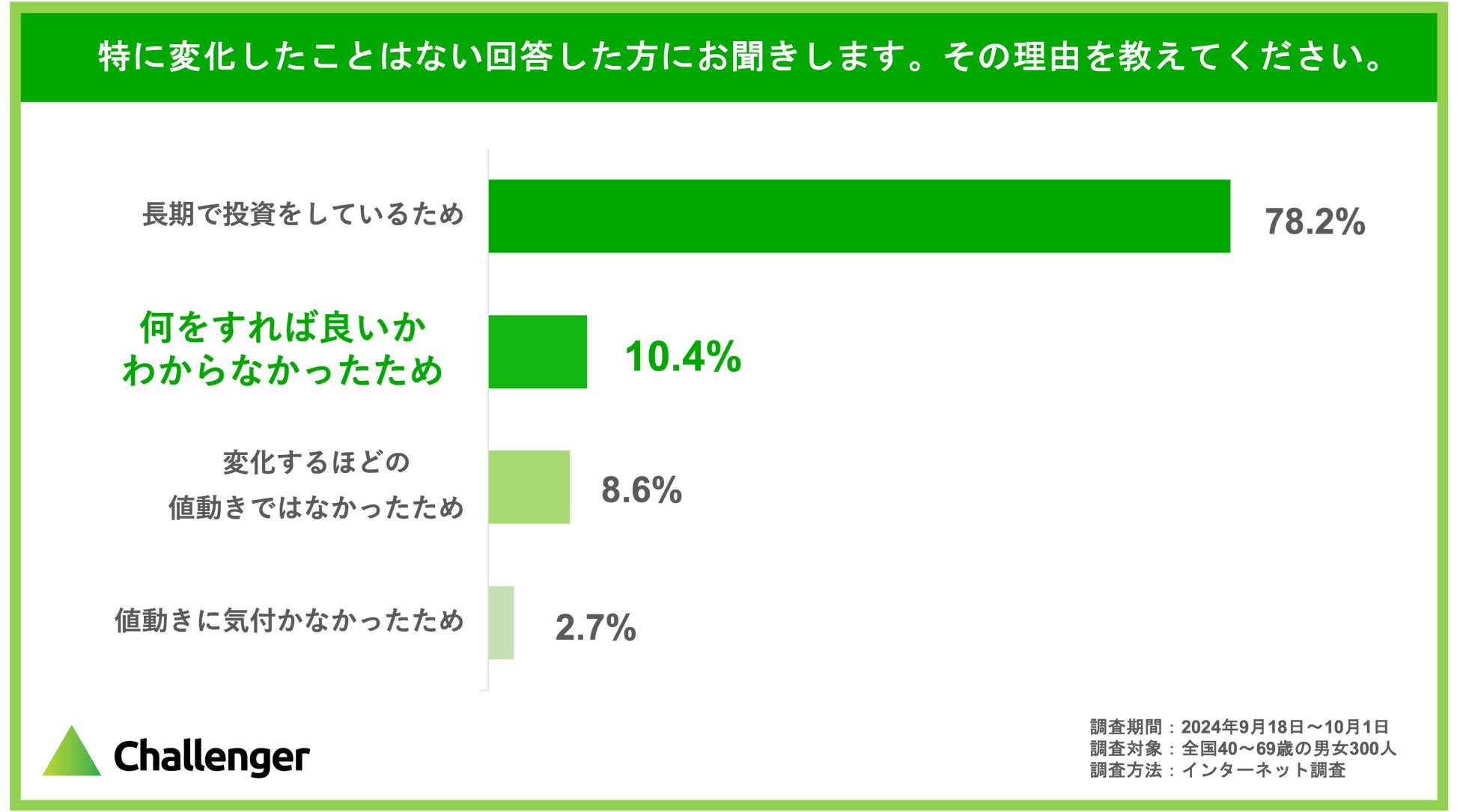 設問1で、「特に変化したことはない」と回答した方に対して、変化しなかった理由について聞いたところ、8割近い方が「長期で投資をしているため(78.2%)」と回答したのに対して、「何をすれば良いかわからなかったため(10.4%)」と回答した方も一定数いることがわかりました。