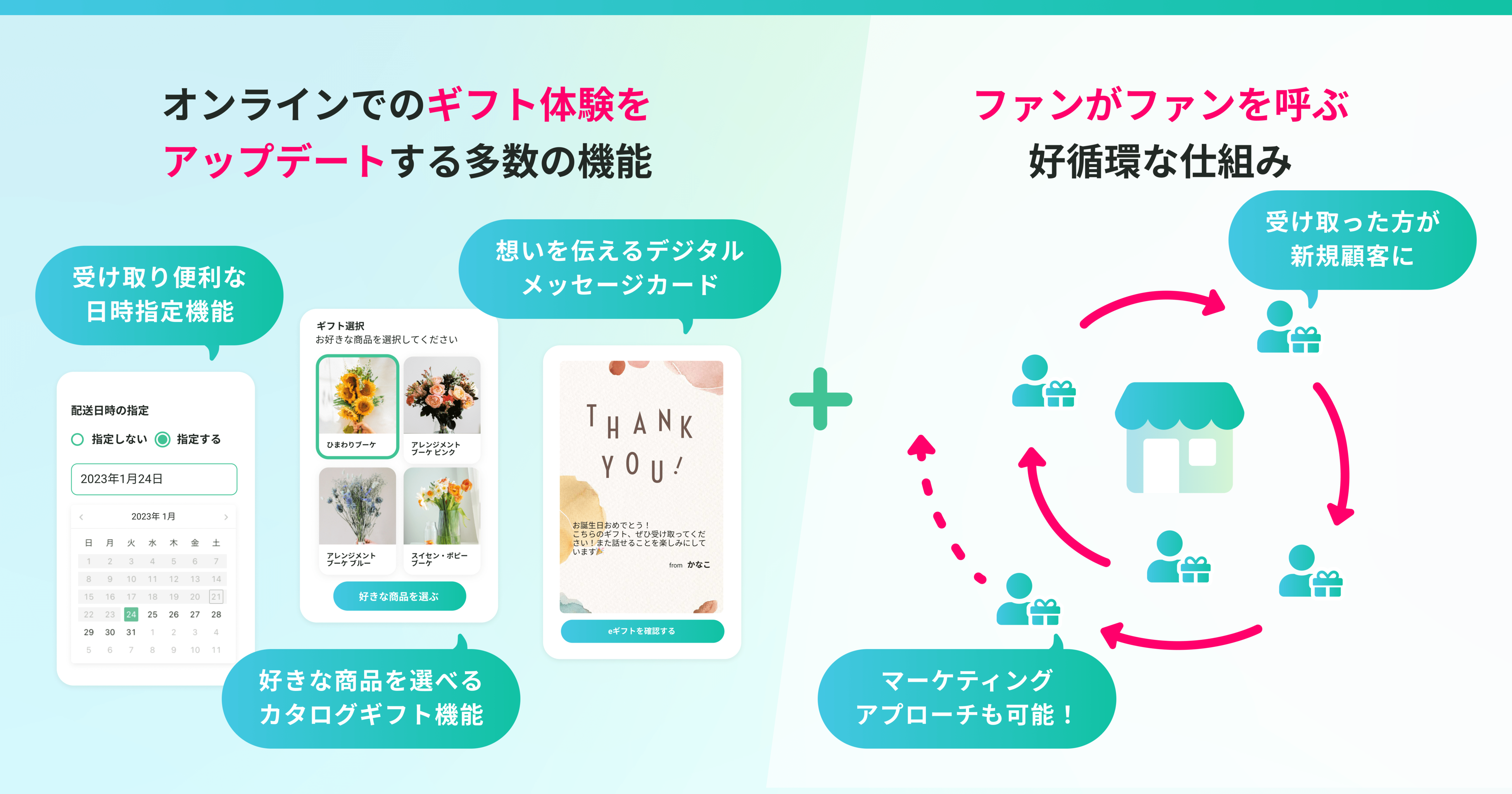 住所を知らない相手に贈れるだけでなく、ギフトを受け取る側が受取日時を指定できる機能や、好きな商品を選べるカタログギフト機能など、「オンラインでのギフト体験」を大きくアップデートしています。ファン層からのギフト送付をきっかけに、ギフトを受け取った方はその商品を認知し、その商品が好み・気に入れば新規顧客として自分用・ギフト用に購入されるという好循環が期待できます。また企業は、 贈る側だけでなく、ギフトを受け取った方の情報も取得することができるので、マーケティングアプローチが可能になり、ファンがファンを呼ぶ仕組みをギフトで創ることができます。